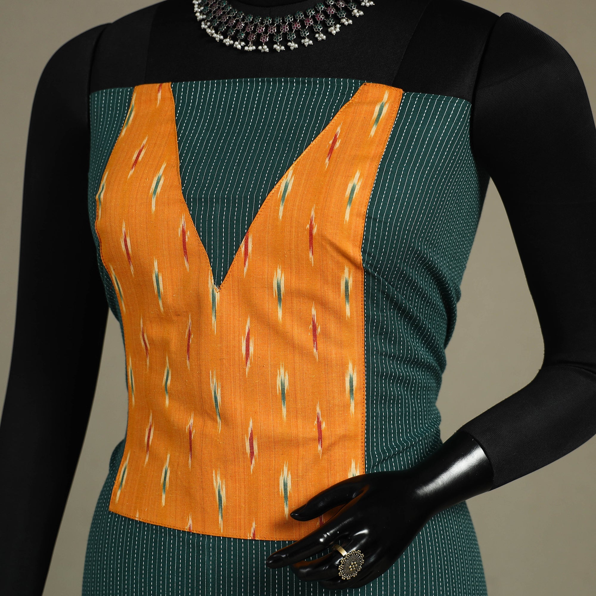 This green plain cotton kurta material is crafted for everyday ease with a subtle artisanal flair. It features delicate running-stitch work and a patchwork detail at the neckline, adding a hint of handcrafted elegance. Ideal for making daily-wear kurtas, office attire, or laid-back casual looks.