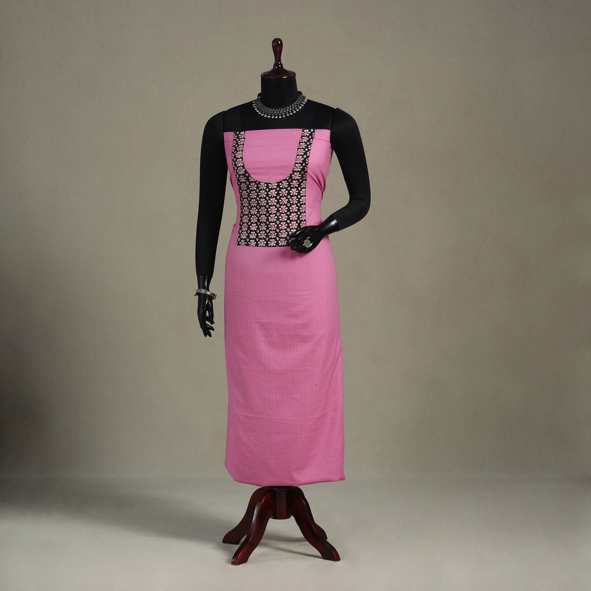 This pink plain cotton kurta material is crafted for everyday ease with a subtle artisanal flair. It features delicate running-stitch work and a patchwork detail at the neckline, adding a hint of handcrafted elegance. Ideal for making daily-wear kurtas, office attire, or laid-back casual looks.