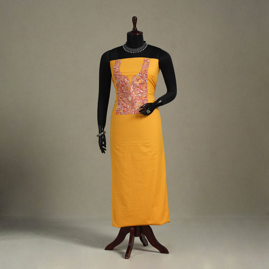 This yellow plain cotton kurta material is crafted for everyday ease with a subtle artisanal flair. It features delicate running-stitch work and a patchwork detail at the neckline, adding a hint of handcrafted elegance. Ideal for making daily-wear kurtas, office attire, or laid-back casual looks.