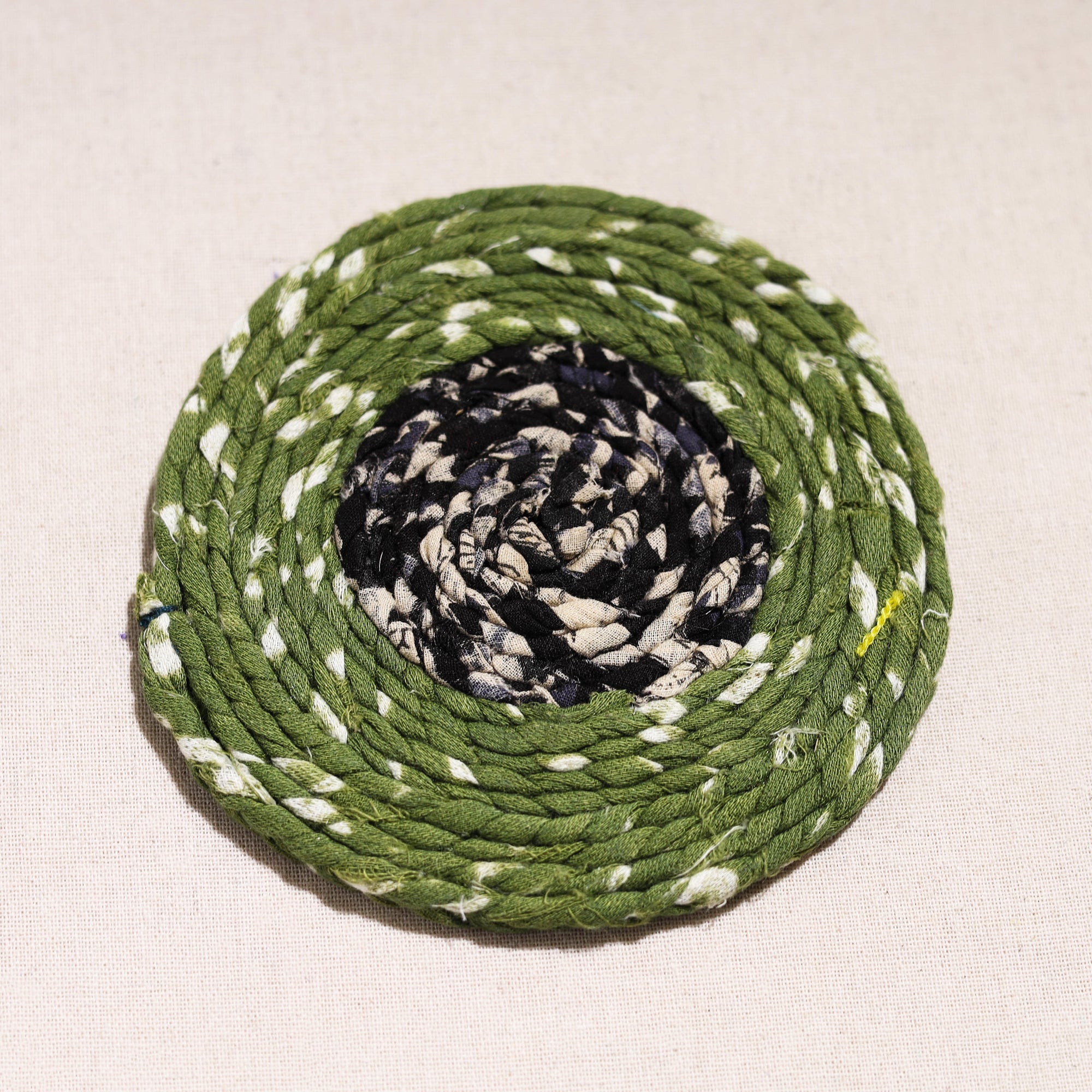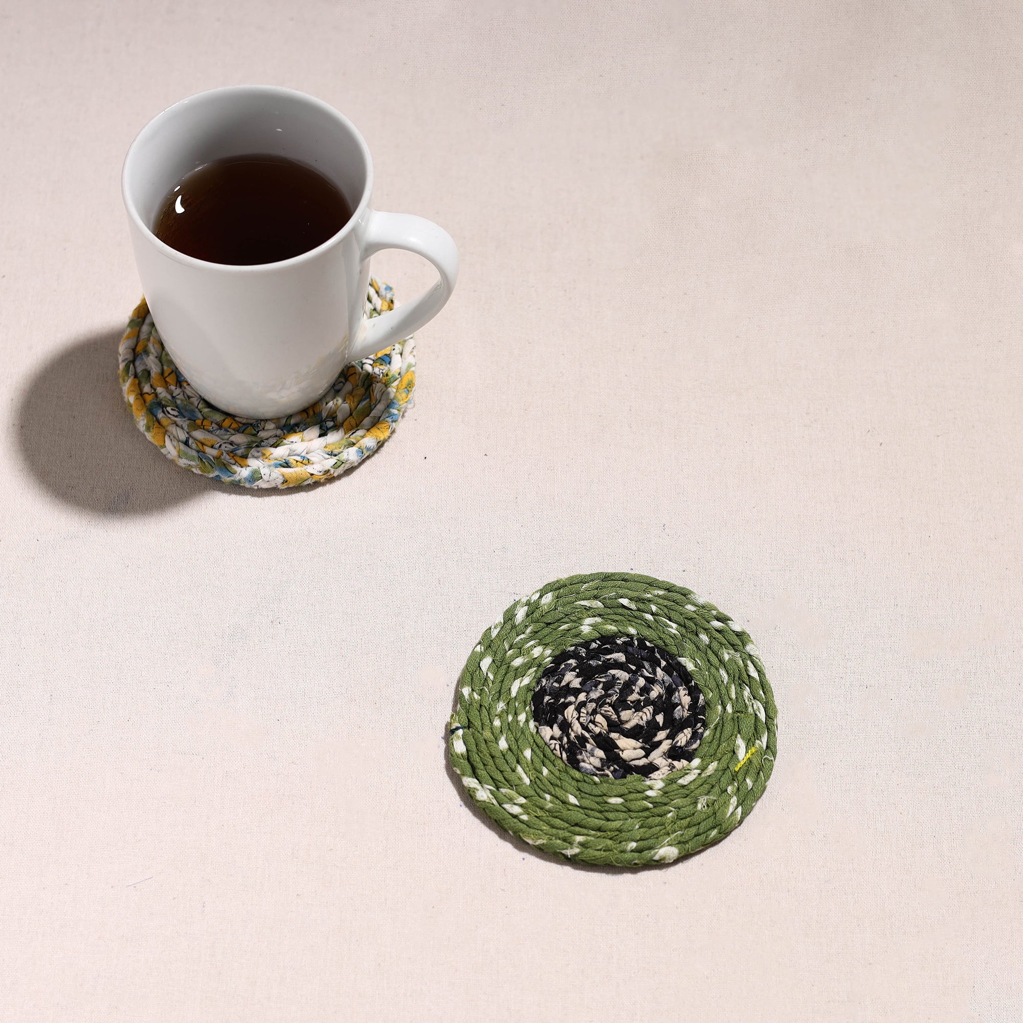 Made with love and care, this upcycled fabric hand-braided coaster. These eco-friendly coasters are handcrafted by artisans using upcycled cotton fabric, giving a new life to textile waste. These coasters protect surfaces from stains and also bring sustainable elegance to your home.