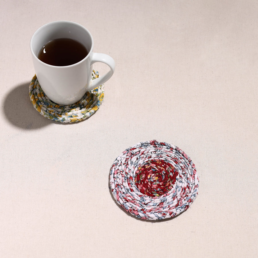Made with love and care, this upcycled fabric hand-braided coaster. These eco-friendly coasters are handcrafted by artisans using upcycled cotton fabric, giving a new life to textile waste. These coasters protect surfaces from stains and also bring sustainable elegance to your home.