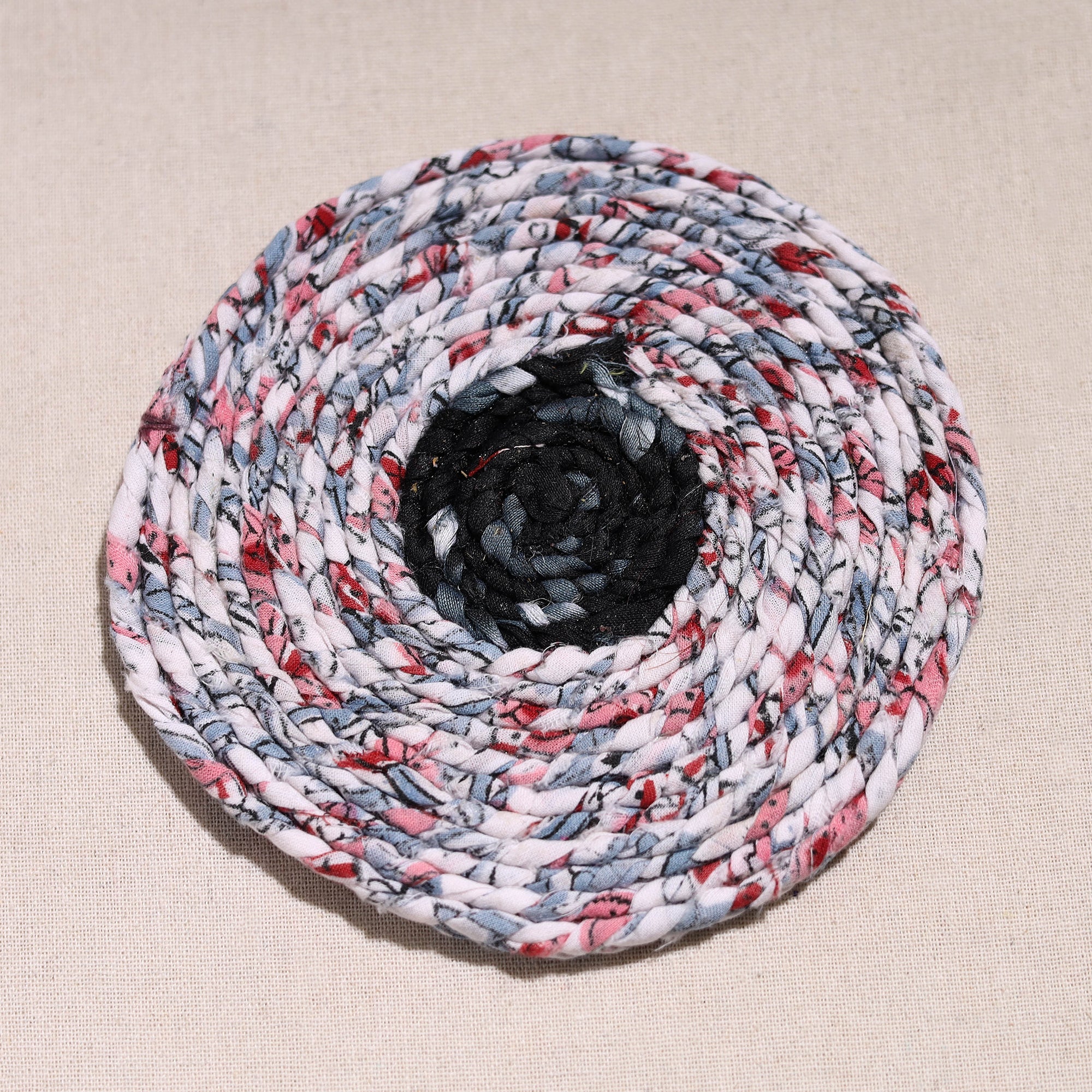 Made with love and care, this upcycled fabric hand-braided coaster. These eco-friendly coasters are handcrafted by artisans using upcycled cotton fabric, giving a new life to textile waste. These coasters protect surfaces from stains and also bring sustainable elegance to your home.