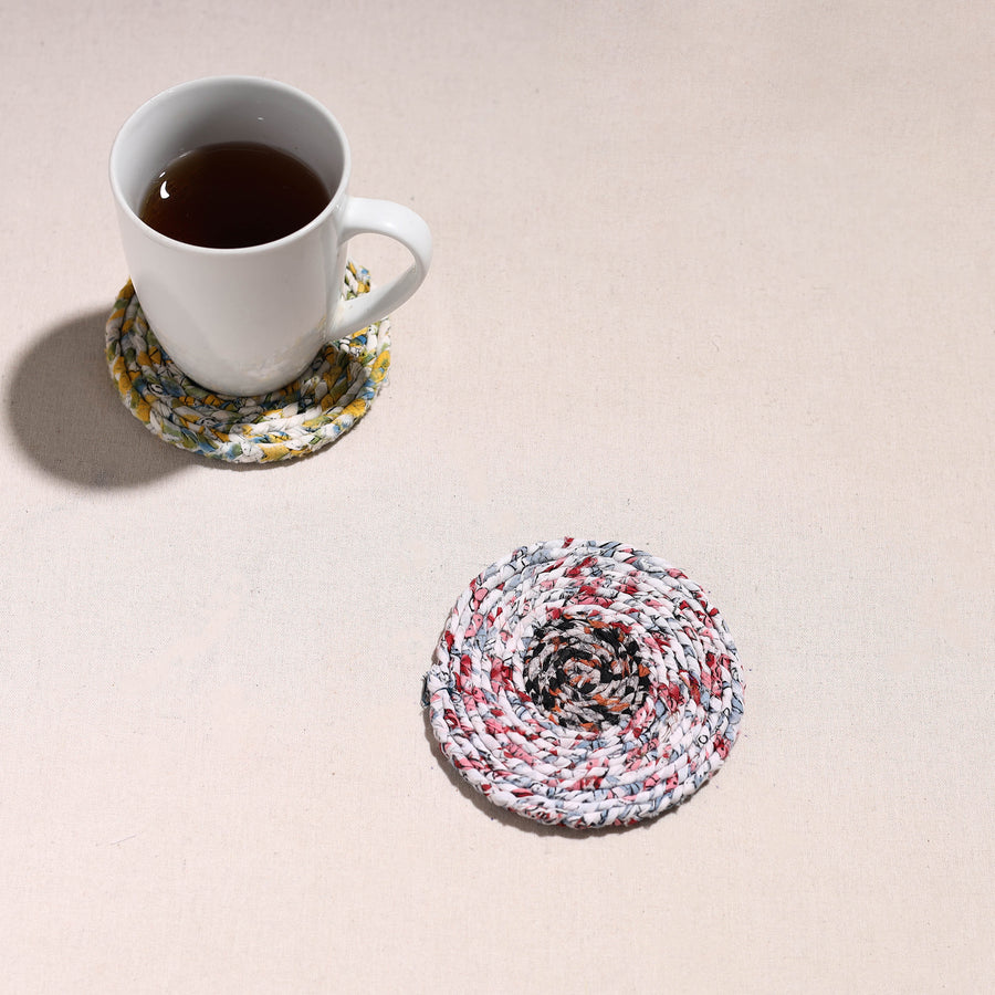 Made with love and care, this upcycled fabric hand-braided coaster. These eco-friendly coasters are handcrafted by artisans using upcycled cotton fabric, giving a new life to textile waste. These coasters protect surfaces from stains and also bring sustainable elegance to your home.