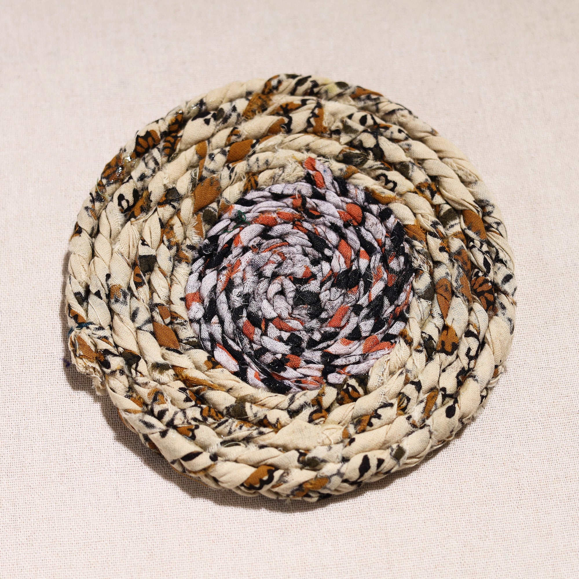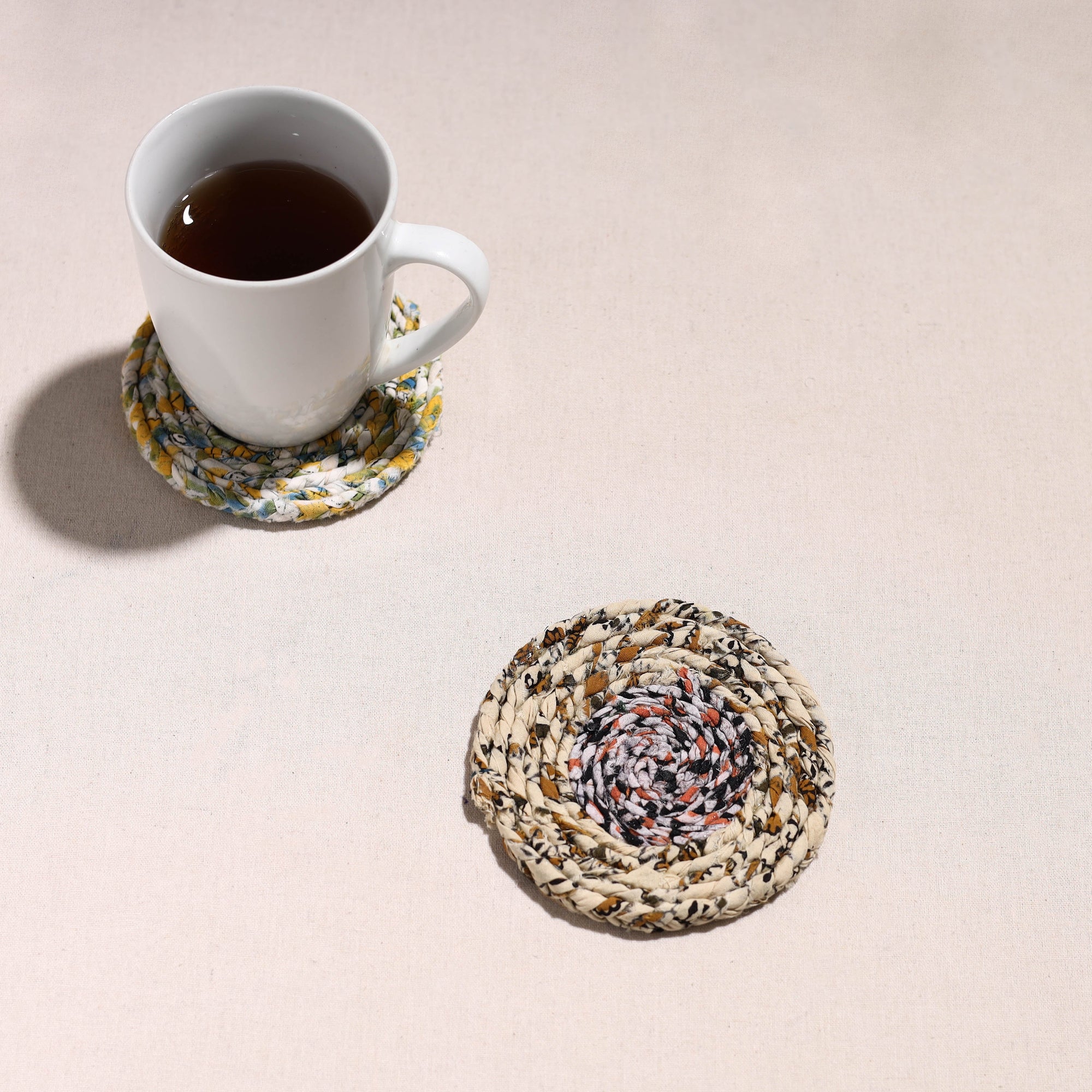 Made with love and care, this upcycled fabric hand-braided coaster. These eco-friendly coasters are handcrafted by artisans using upcycled cotton fabric, giving a new life to textile waste. These coasters protect surfaces from stains and also bring sustainable elegance to your home.