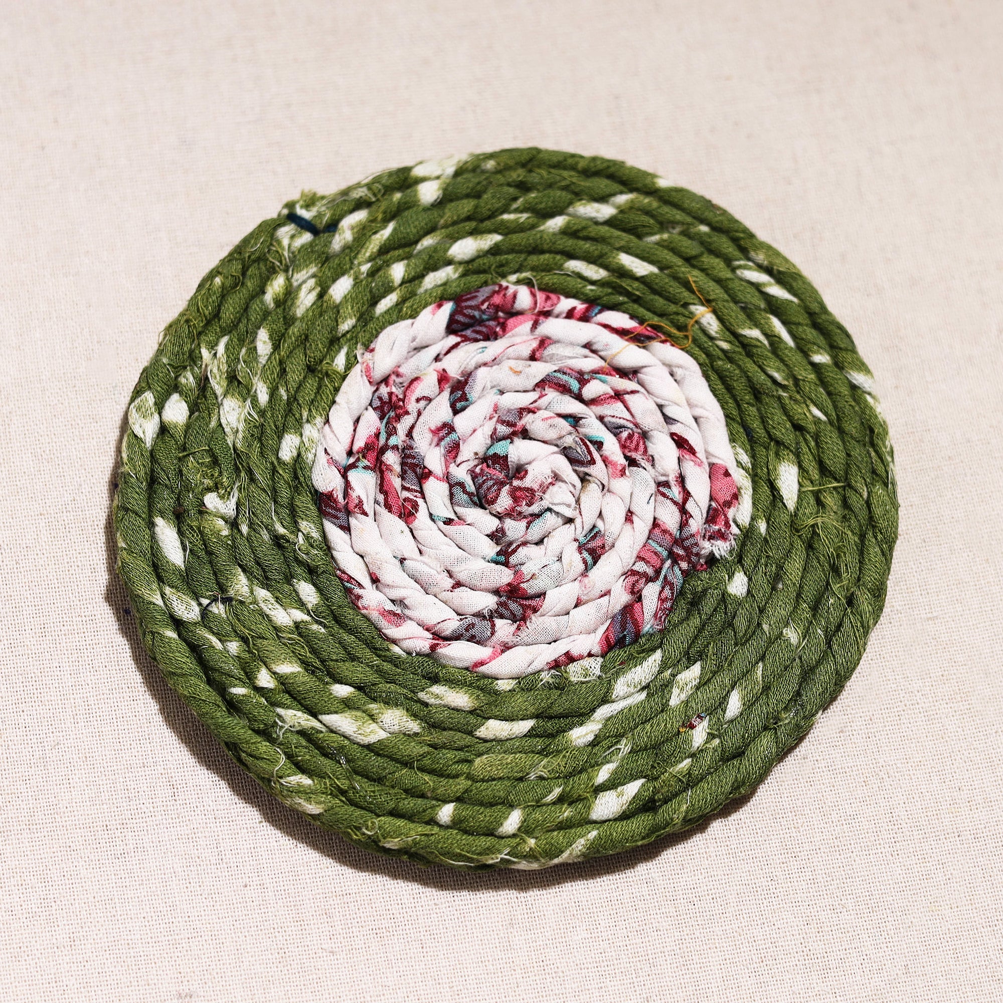 Made with love and care, this upcycled fabric hand-braided coaster. These eco-friendly coasters are handcrafted by artisans using upcycled cotton fabric, giving a new life to textile waste. These coasters protect surfaces from stains and also bring sustainable elegance to your home.