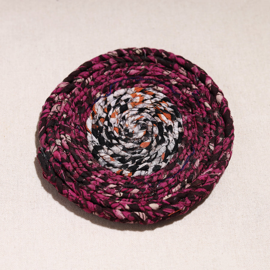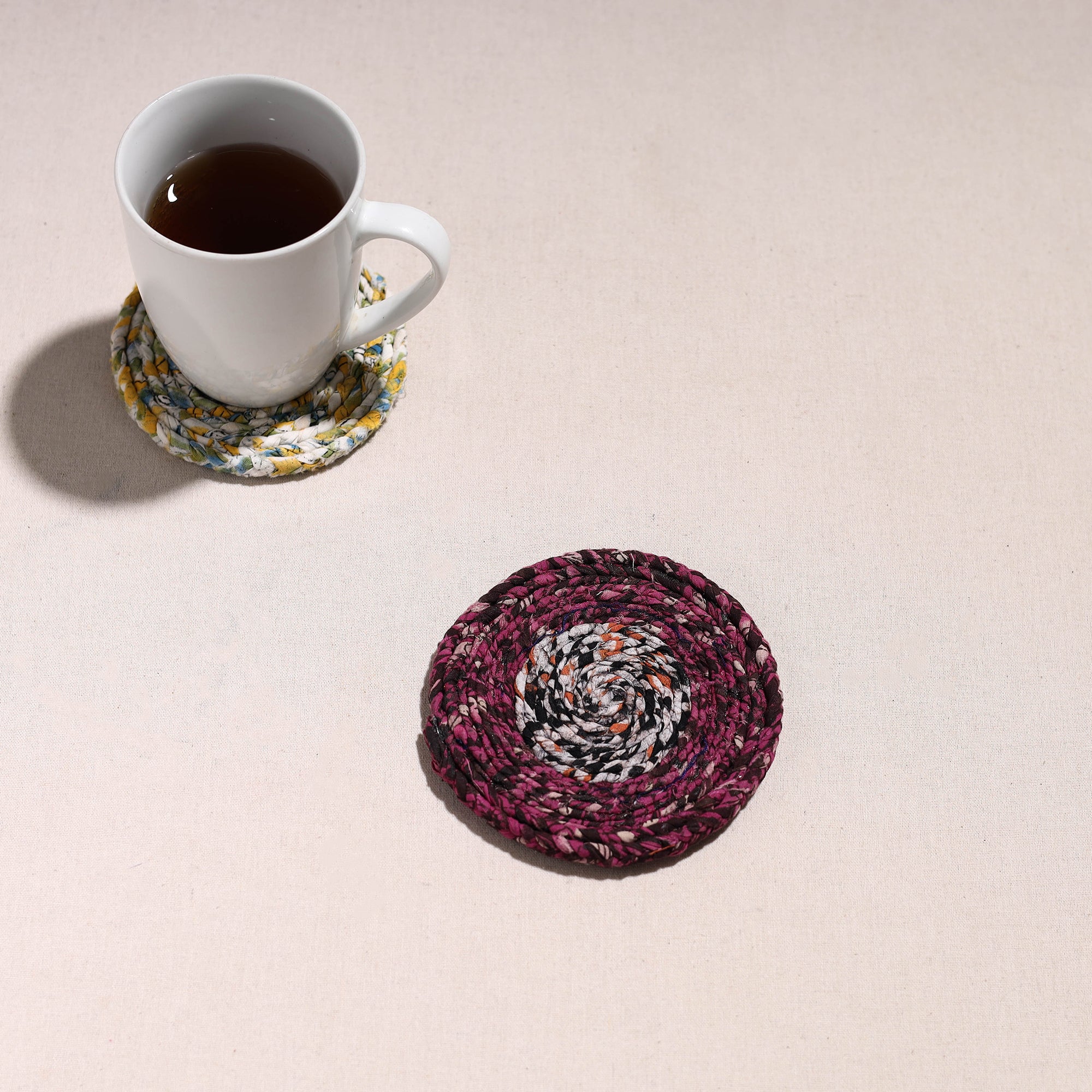 Made with love and care, this upcycled fabric hand-braided coaster. These eco-friendly coasters are handcrafted by artisans using upcycled cotton fabric, giving a new life to textile waste. These coasters protect surfaces from stains and also bring sustainable elegance to your home.