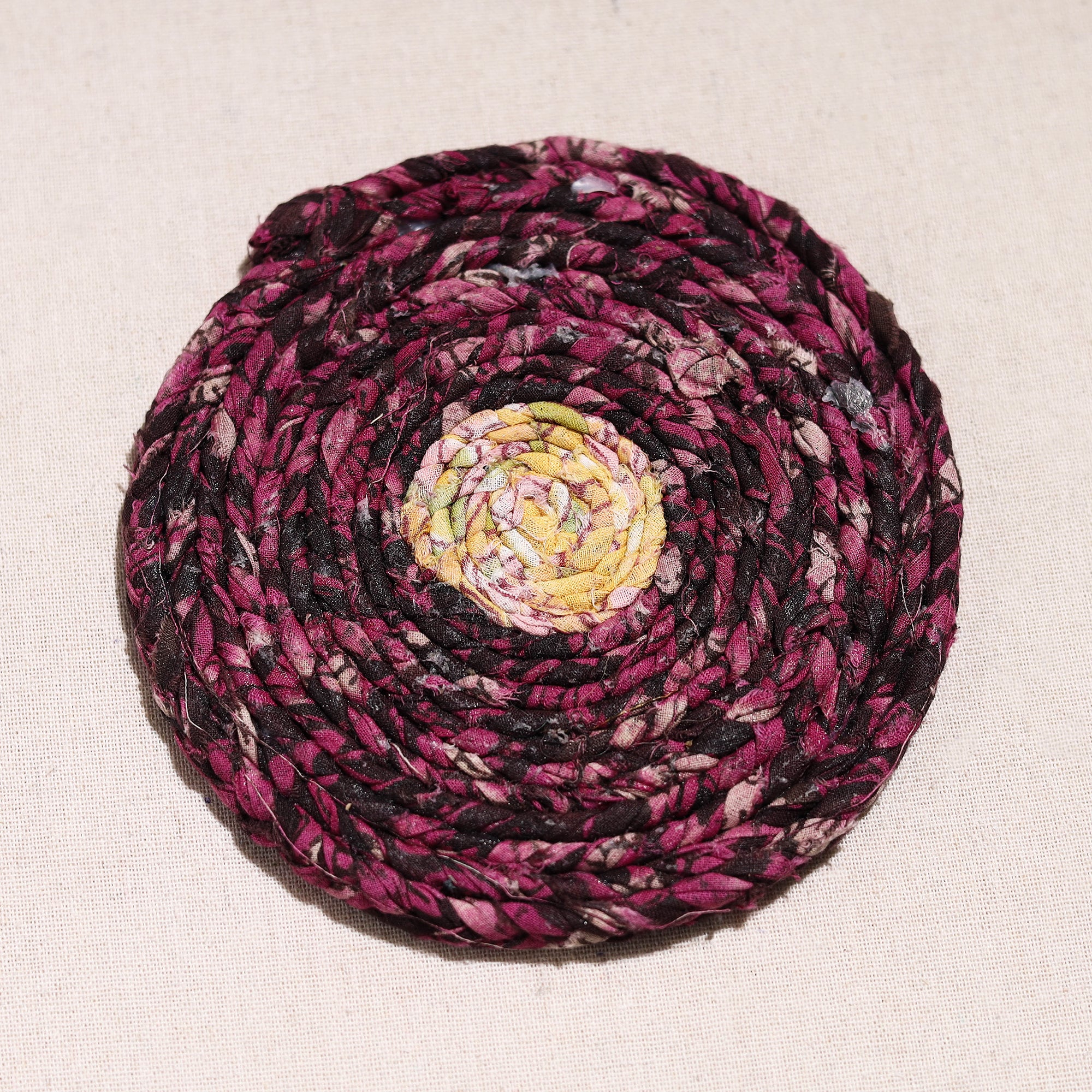 Made with love and care, this upcycled fabric hand-braided coaster. These eco-friendly coasters are handcrafted by artisans using upcycled cotton fabric, giving a new life to textile waste. These coasters protect surfaces from stains and also bring sustainable elegance to your home.