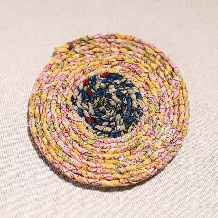Made with love and care, this upcycled fabric hand-braided coaster. These eco-friendly coasters are handcrafted by artisans using upcycled cotton fabric, giving a new life to textile waste. These coasters protect surfaces from stains and also bring sustainable elegance to your home.