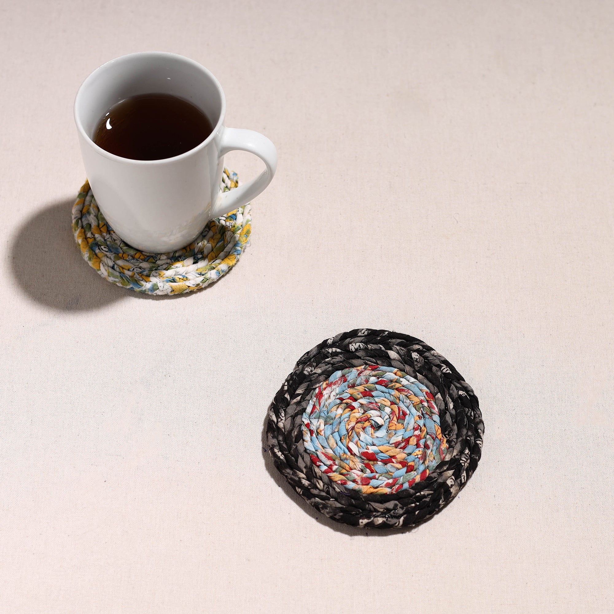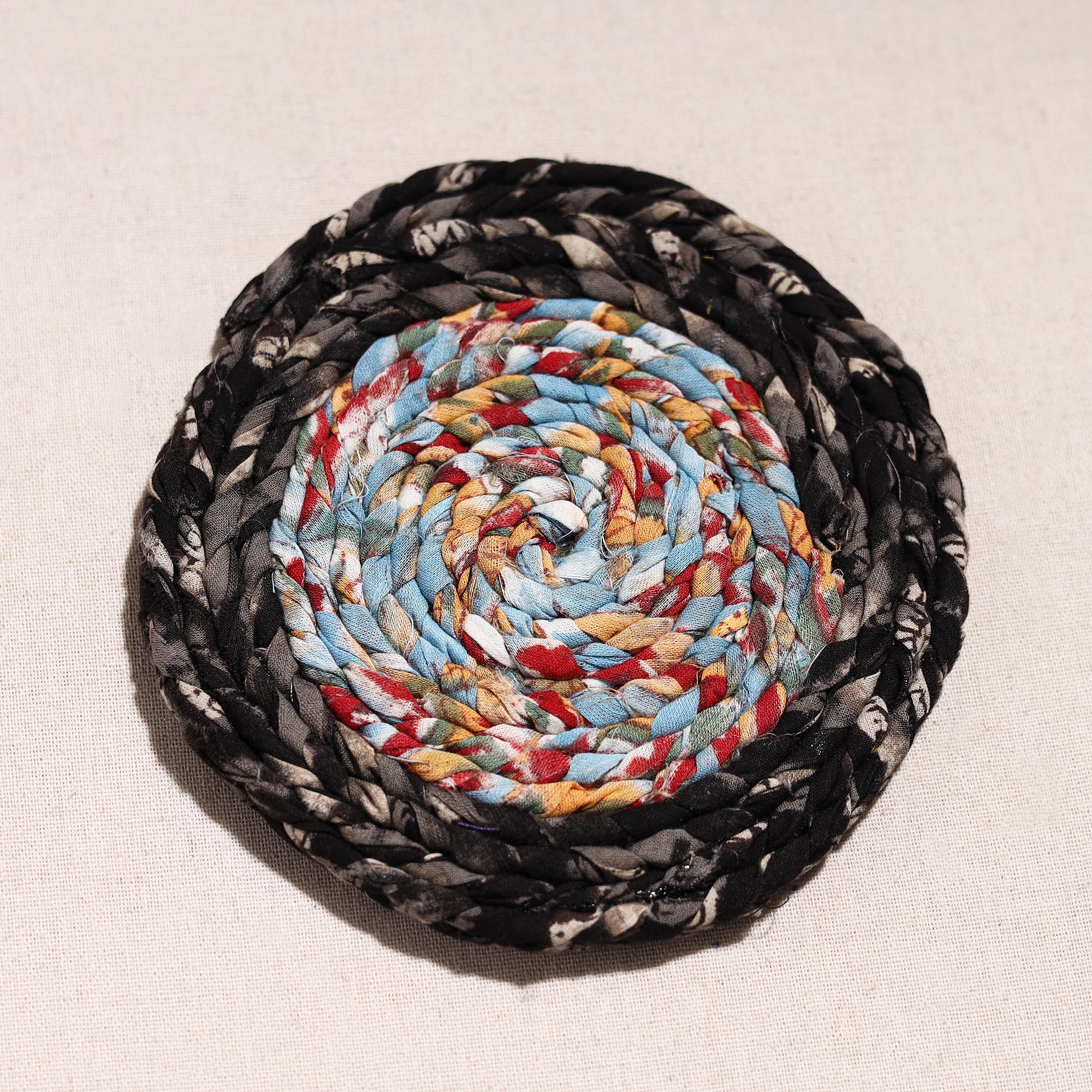 Made with love and care, this upcycled fabric hand-braided coaster. These eco-friendly coasters are handcrafted by artisans using upcycled cotton fabric, giving a new life to textile waste. These coasters protect surfaces from stains and also bring sustainable elegance to your home.