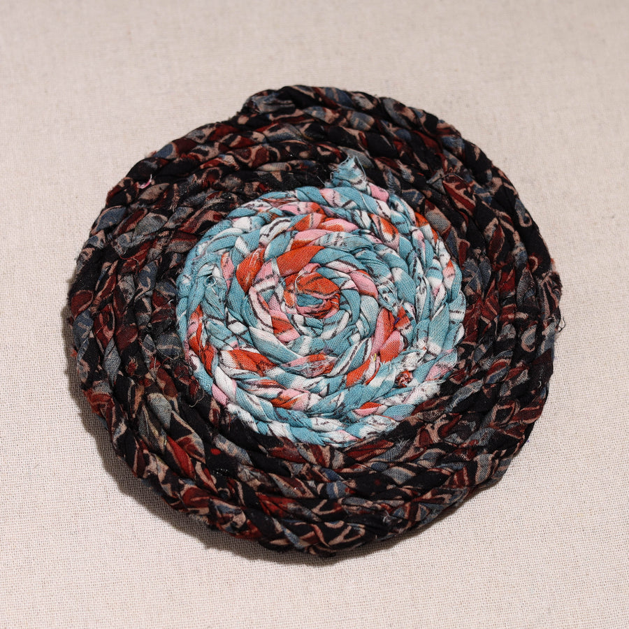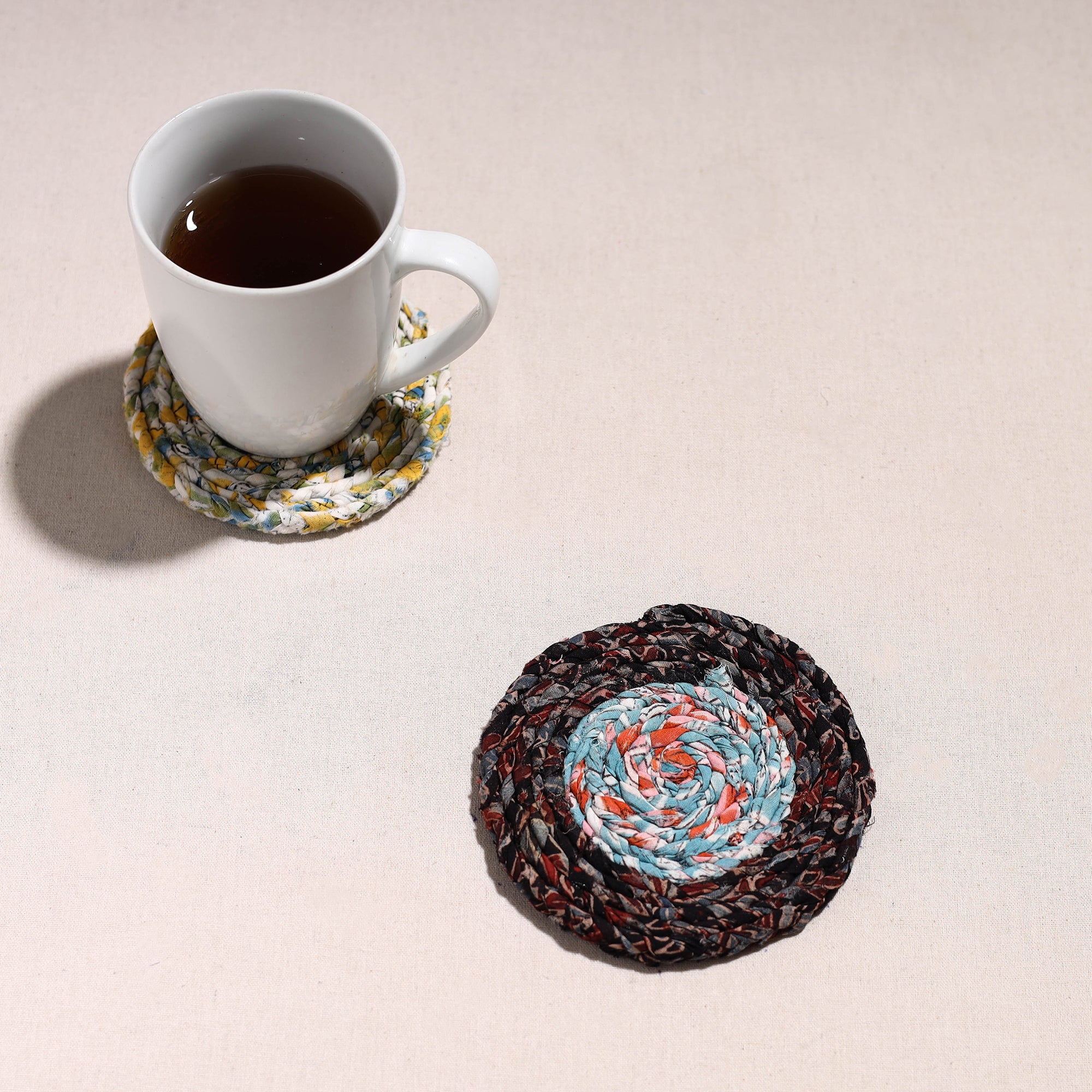 Made with love and care, this upcycled fabric hand-braided coaster. These eco-friendly coasters are handcrafted by artisans using upcycled cotton fabric, giving a new life to textile waste. These coasters protect surfaces from stains and also bring sustainable elegance to your home.