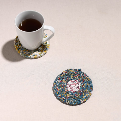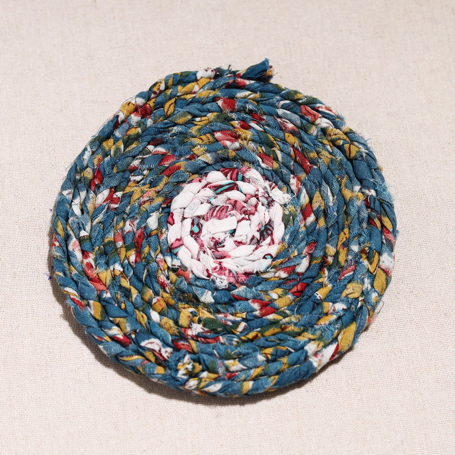 Made with love and care, this upcycled fabric hand-braided coaster. These eco-friendly coasters are handcrafted by artisans using upcycled cotton fabric, giving a new life to textile waste. These coasters protect surfaces from stains and also bring sustainable elegance to your home.