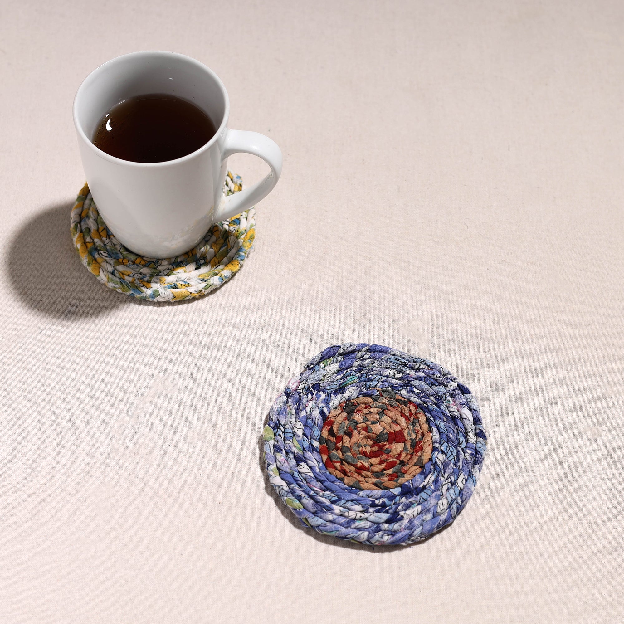 Made with love and care, this upcycled fabric hand-braided coaster. These eco-friendly coasters are handcrafted by artisans using upcycled cotton fabric, giving a new life to textile waste. These coasters protect surfaces from stains and also bring sustainable elegance to your home.