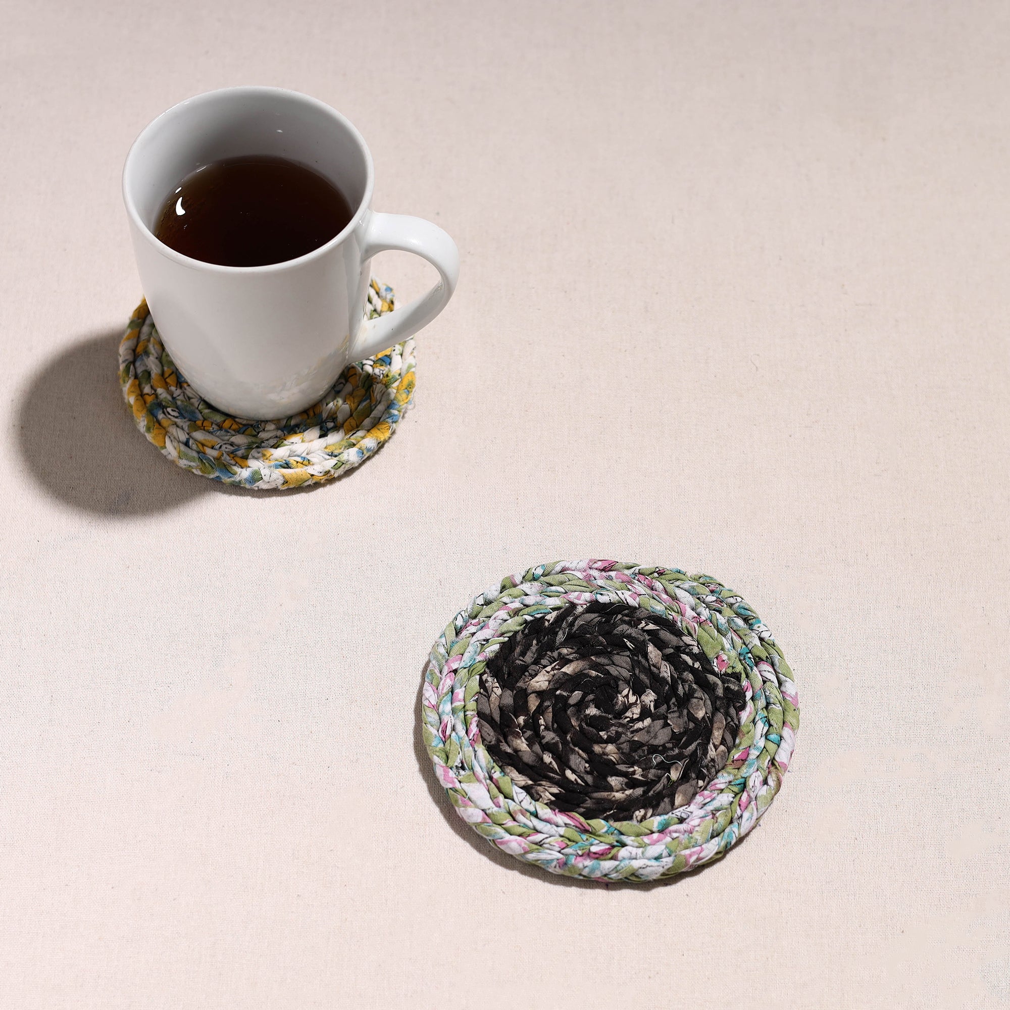 Made with love and care, this upcycled fabric hand-braided coaster. These eco-friendly coasters are handcrafted by artisans using upcycled cotton fabric, giving a new life to textile waste. These coasters protect surfaces from stains and also bring sustainable elegance to your home.