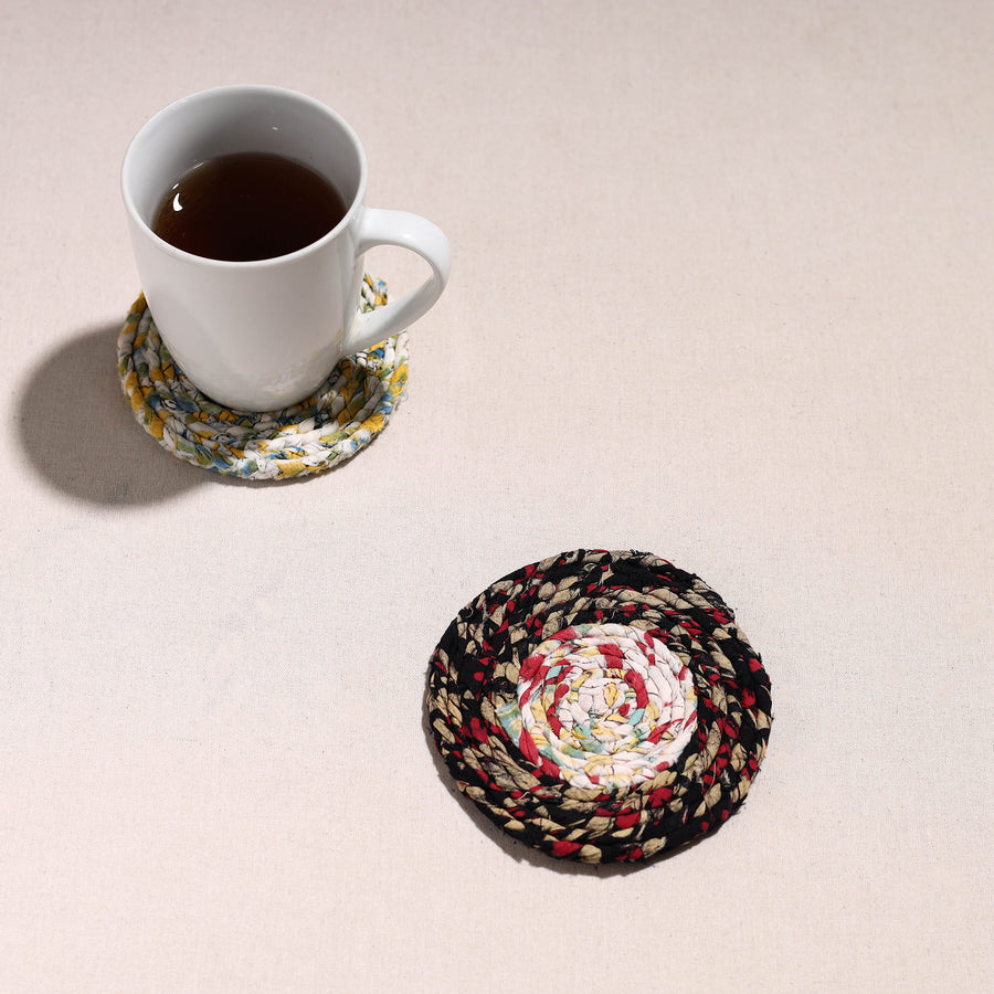 Made with love and care, this upcycled fabric hand-braided coaster. These eco-friendly coasters are handcrafted by artisans using upcycled cotton fabric, giving a new life to textile waste. These coasters protect surfaces from stains and also bring sustainable elegance to your home.