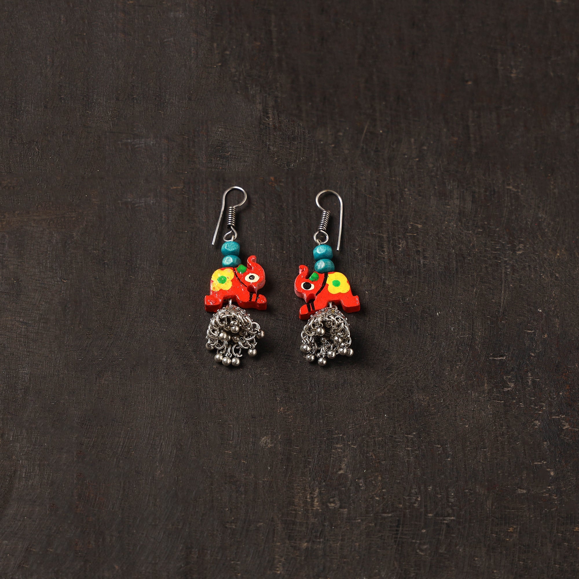 Handcrafted german silver jhumki earrings are beautifully detailed with red wooden elephant and beads. Made by women skilled artisans, they offer a lightweight and perfect for adding a unique charm to festive and everyday looks. German silver adds durability and is known for its strong, long-lasting finish.