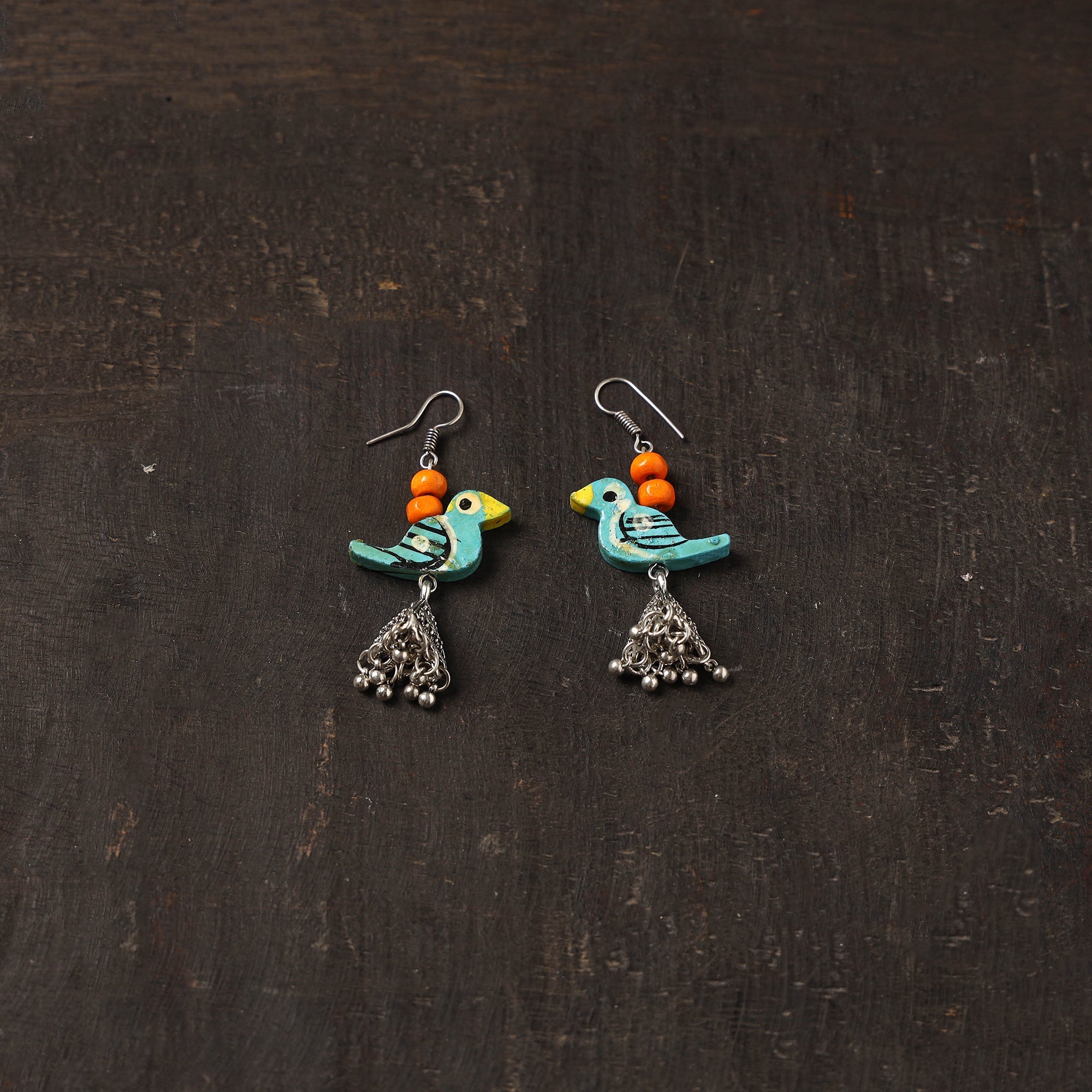Handcrafted german silver jhumki earrings are beautifully detailed with blue wooden bird and beads. Made by iTokri’s skilled artisans, they offer a lightweight, and perfect for adding a unique charm to festive and everyday looks. German silver adds durability and is known for its strong, long-lasting finish.