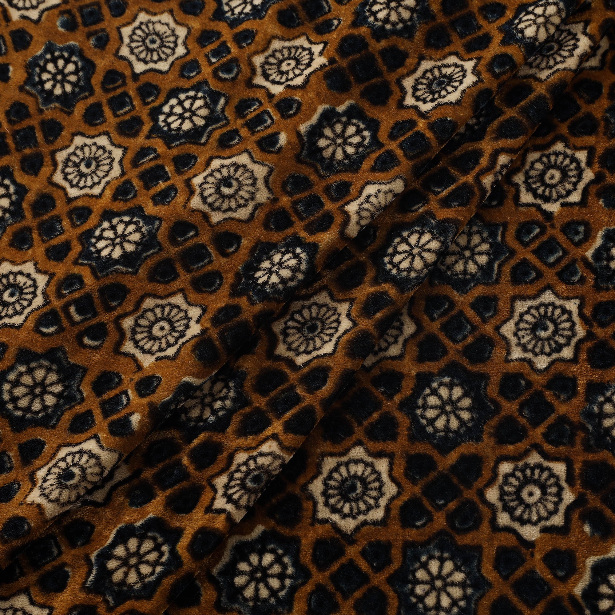 Ajrakh fabric by artisan Sufiyan Ismail Khatri is crafted using natural-dyeing and resist block-printing techniques. This ancient craft is estimated to be around 4,500 years old. The Ajrakh artisans in India originally migrated from Sindh to the Kutch region of Gujarat and to Barmer in Rajasthan. Ajrakh is also the traditional attire of the Maldhari pastoral community of Bhuj. The process is long and detailed, involving multiple stages where each layer of colour is printed only after a resting period, allowing the cloth to absorb the dye fully. Made from velvet and viscose blend, it is ideal for creating kurtas, shirts, dresses or even home decor items.