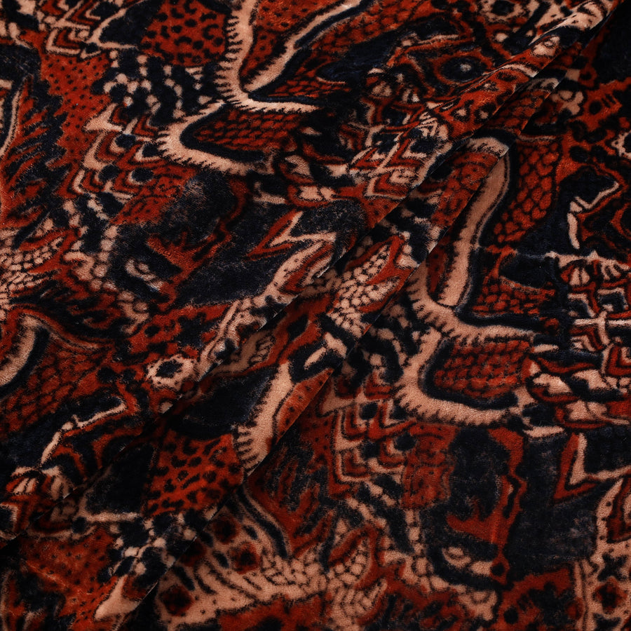 Ajrakh fabric by artisan Sufiyan Ismail Khatri is crafted using natural-dyeing and resist block-printing techniques. This ancient craft is estimated to be around 4,500 years old. The Ajrakh artisans in India originally migrated from Sindh to the Kutch region of Gujarat and to Barmer in Rajasthan. Ajrakh is also the traditional attire of the Maldhari pastoral community of Bhuj. The process is long and detailed, involving multiple stages where each layer of colour is printed only after a resting period, allowing the cloth to absorb the dye fully. Made from velvet and viscose blend, it is ideal for creating kurtas, shirts, dresses or even home decor items.