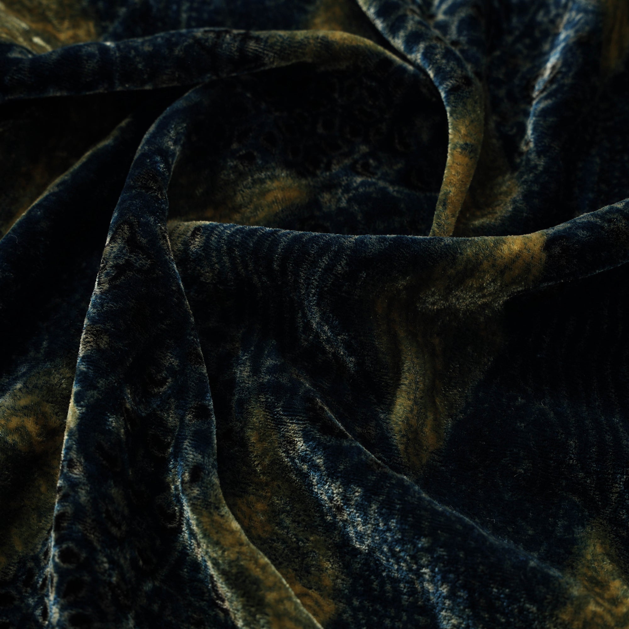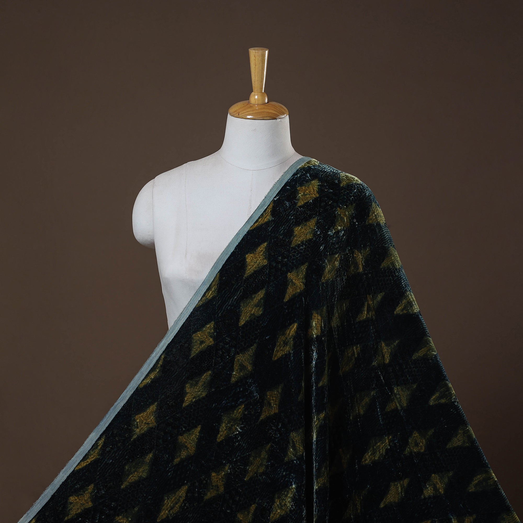 Ajrakh fabric by artisan Sufiyan Ismail Khatri is crafted using natural-dyeing and resist block-printing techniques. This ancient craft is estimated to be around 4,500 years old. The Ajrakh artisans in India originally migrated from Sindh to the Kutch region of Gujarat and to Barmer in Rajasthan. Ajrakh is also the traditional attire of the Maldhari pastoral community of Bhuj. The process is long and detailed, involving multiple stages where each layer of colour is printed only after a resting period, allowing the cloth to absorb the dye fully. Made from velvet and viscose blend, it is ideal for creating kurtas, shirts, dresses or even home decor items.