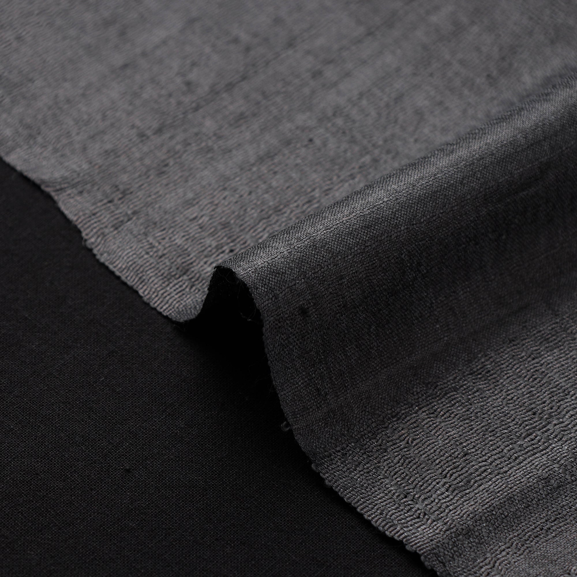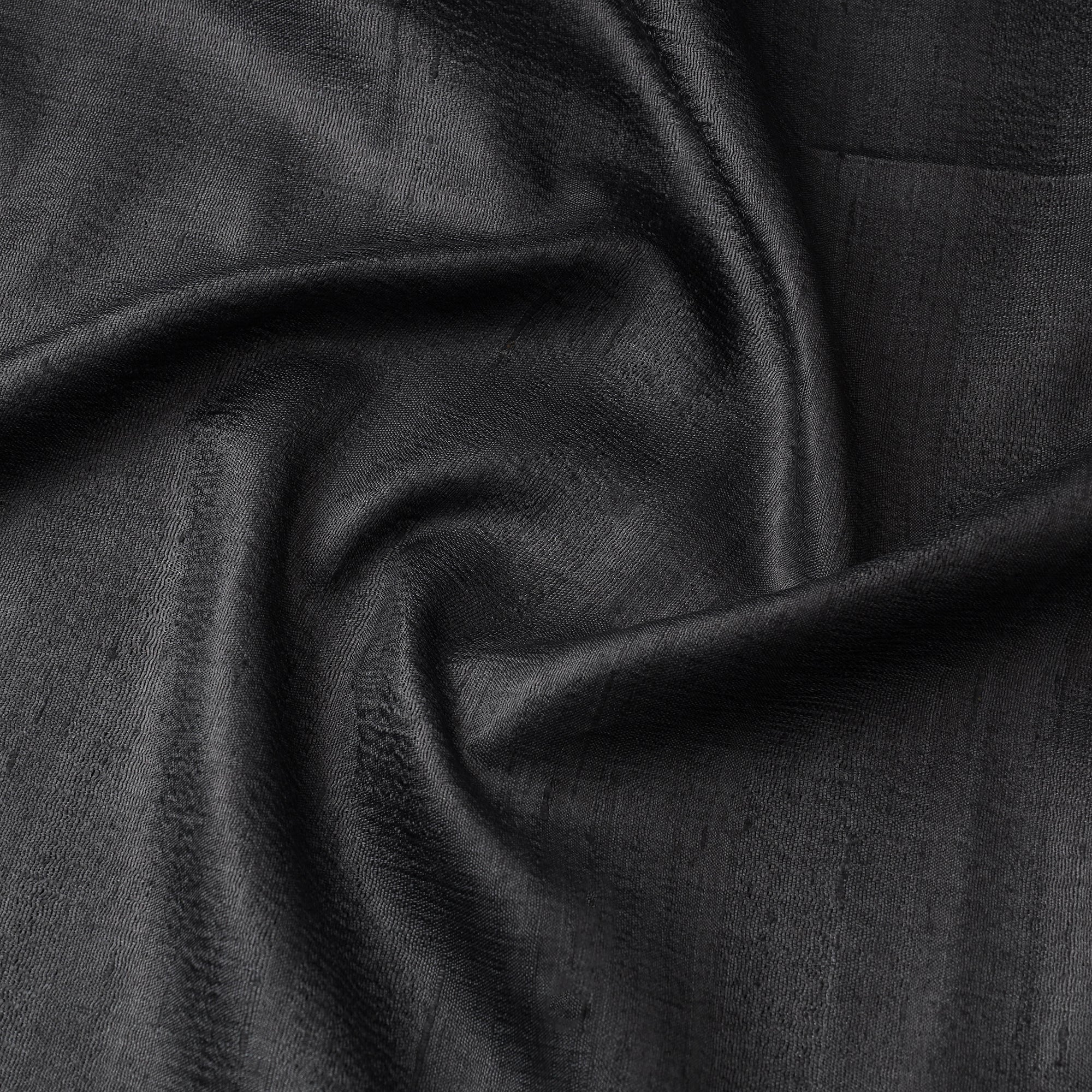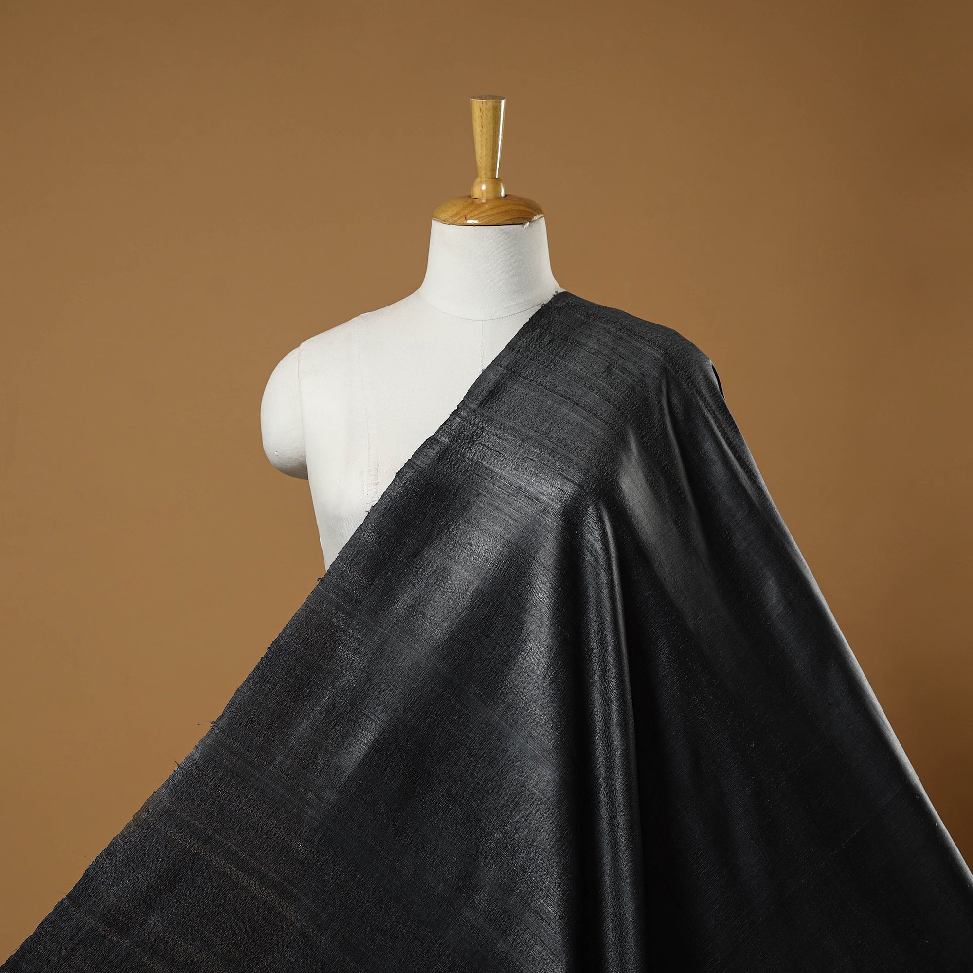 Black tussar x ghicha silk fabric beautifully combines the natural shine of tussar with the soft, breathable texture of Ghicha yarn. Handwoven by skilled artisans from Vidarbha, this plain fabric features subtle textures and an elegant appeal. Perfect for all seasons. Ideal for apparel and elegant home decor accents.