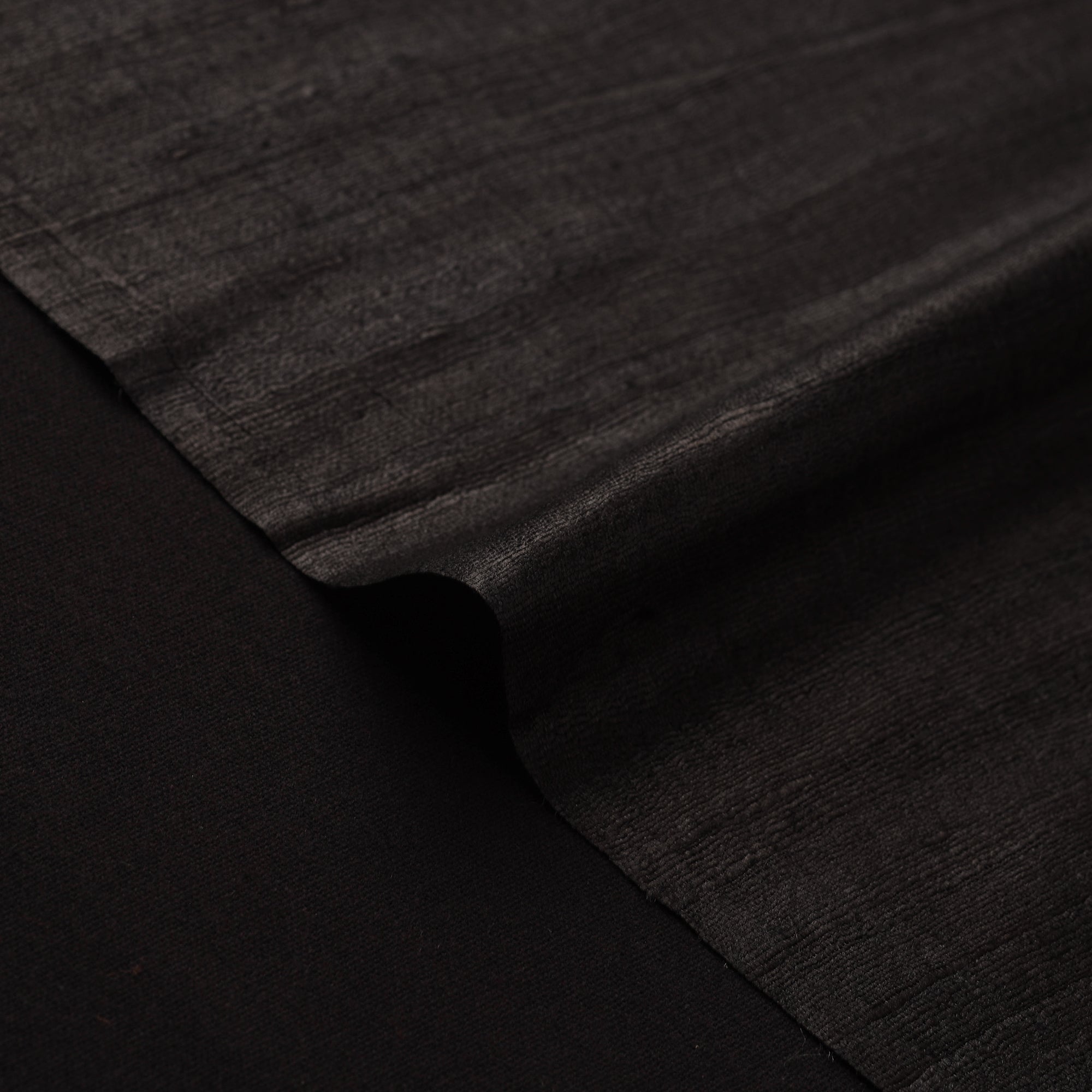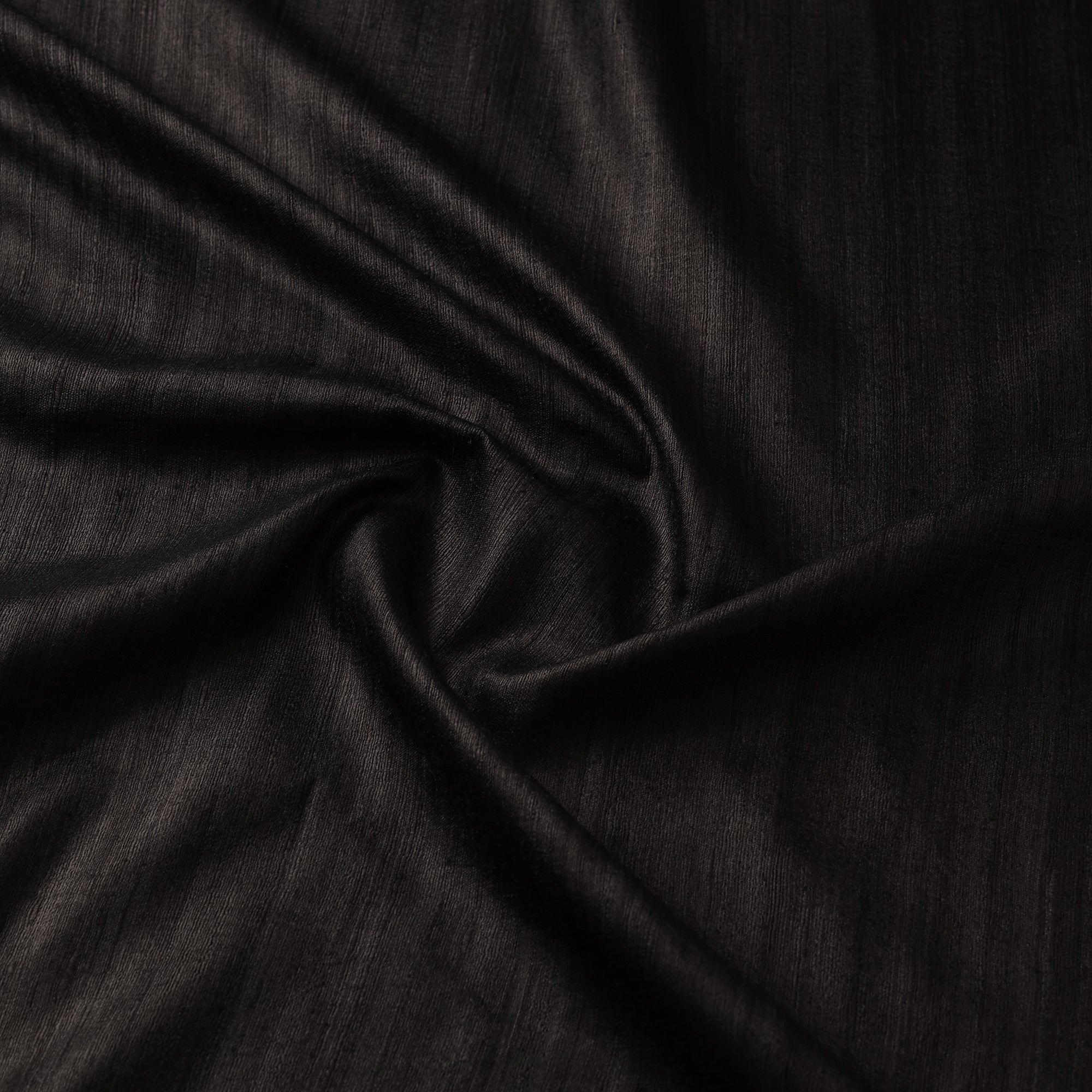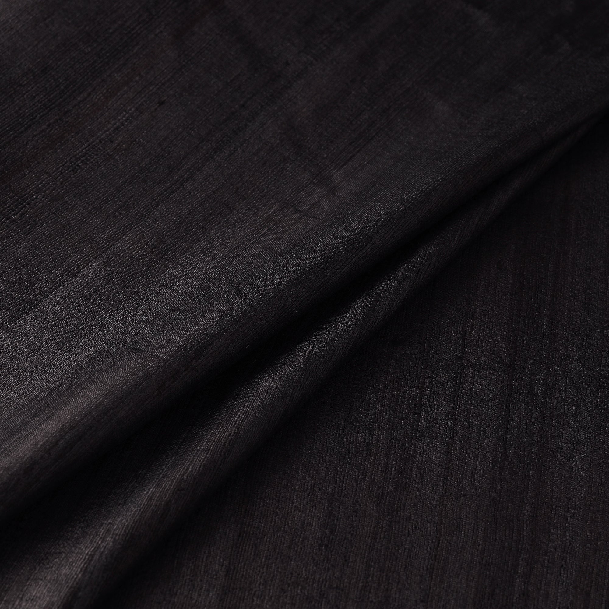 Black handwoven tussar x ghicha silk fabric by skilled artisans from Vidarbha, beautifully combines the natural sheen of Tussar with the crisp, textured feel of dupion yarn. This plain fabric showcases subtle textures and an elegant appeal. Perfect for all seasons, it’s ideal for apparel and refined home decor accents.