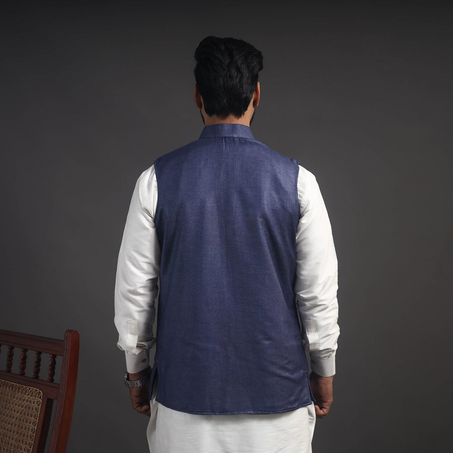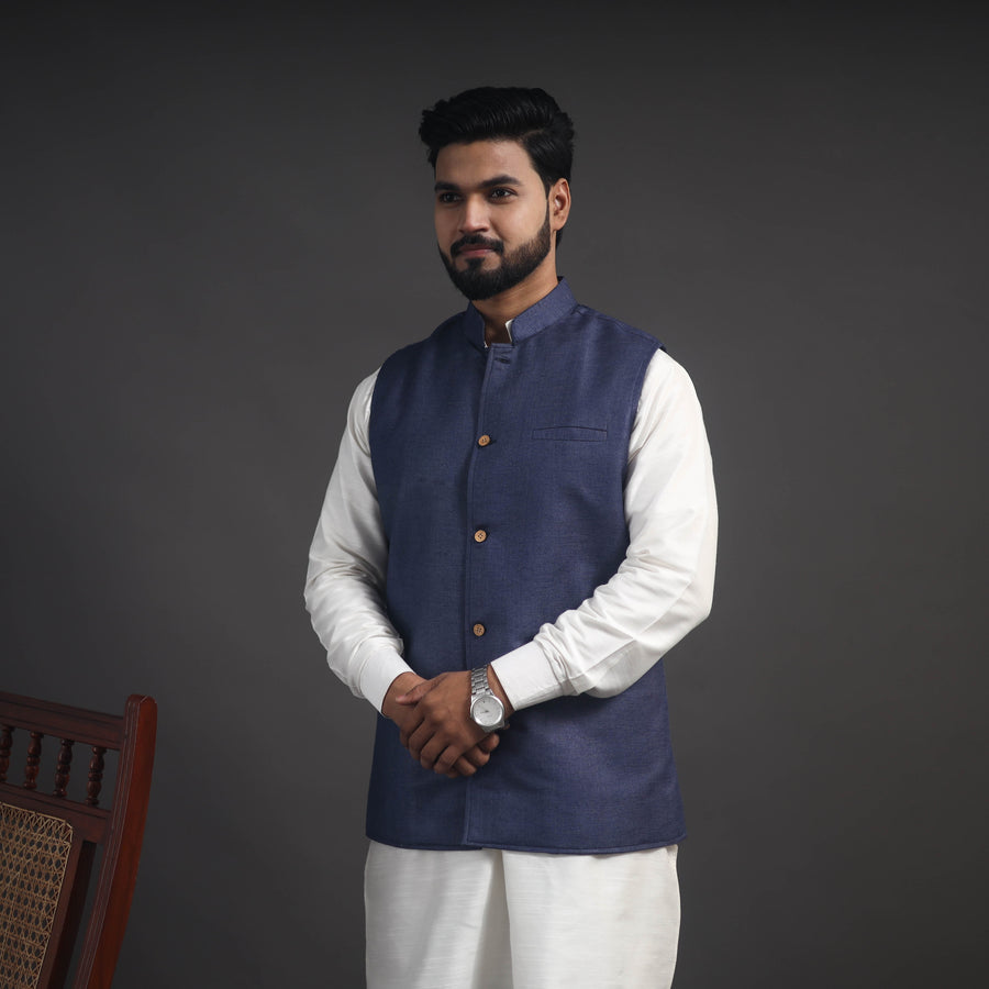 This blue vidarbha tussar x katia silk handloom nehru jacket for men. Featuring a sleeveless design, chinese collar, and three functional pockets, it blends heritage with modern style. The silk fabric is both comfortable and elegant, making it ideal for formal or festive occasions.