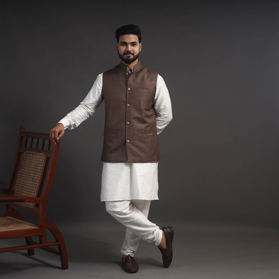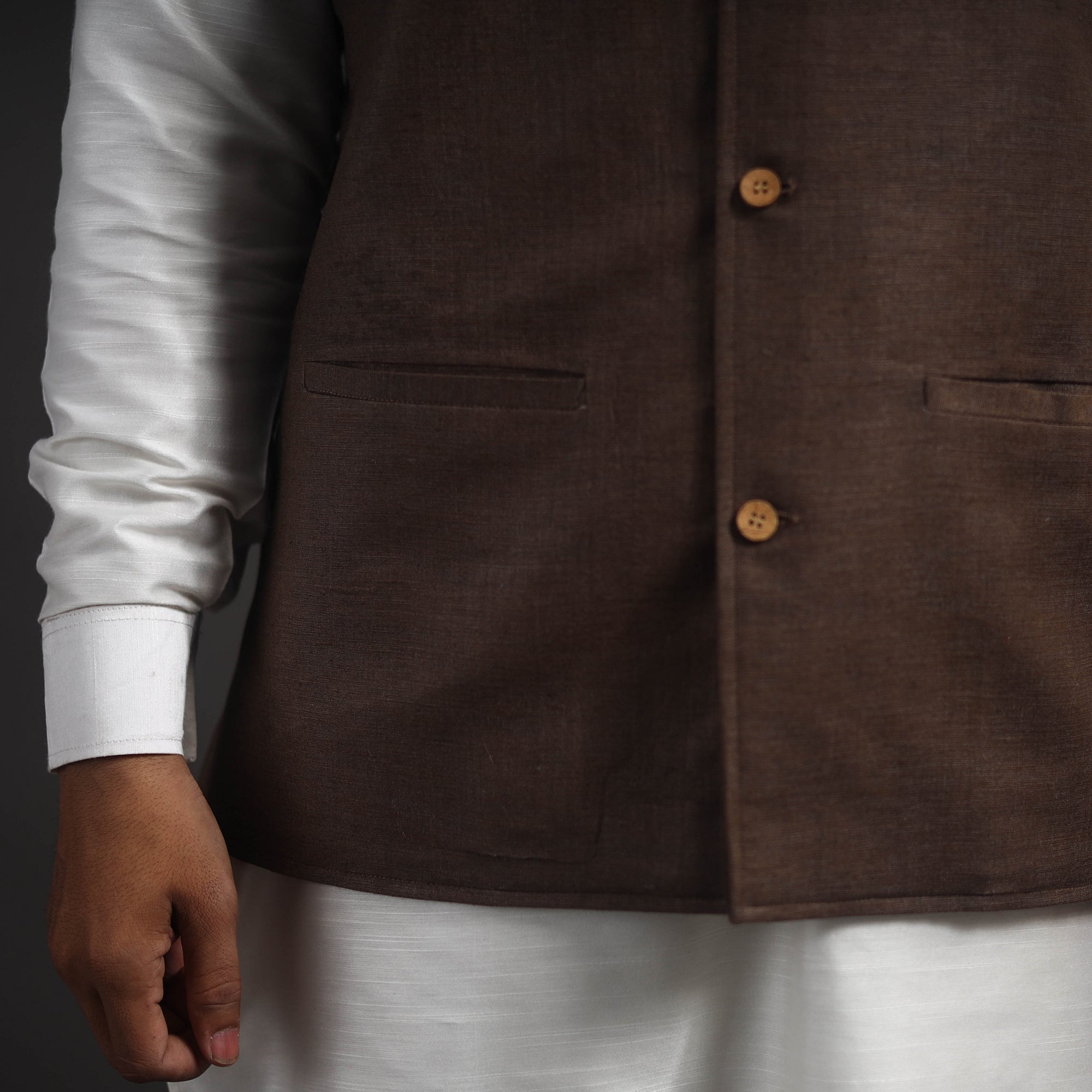 This brown vidarbha tussar x katia silk handloom nehru jacket for men. Featuring a sleeveless design, chinese collar, and three functional pockets, it blends heritage with modern style. The silk fabric is both comfortable and elegant, making it ideal for formal or festive occasions.