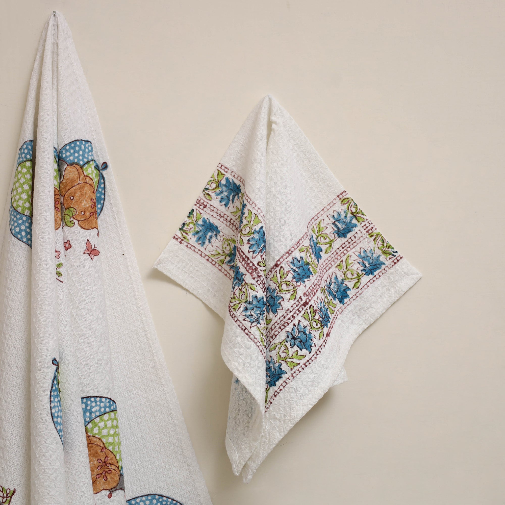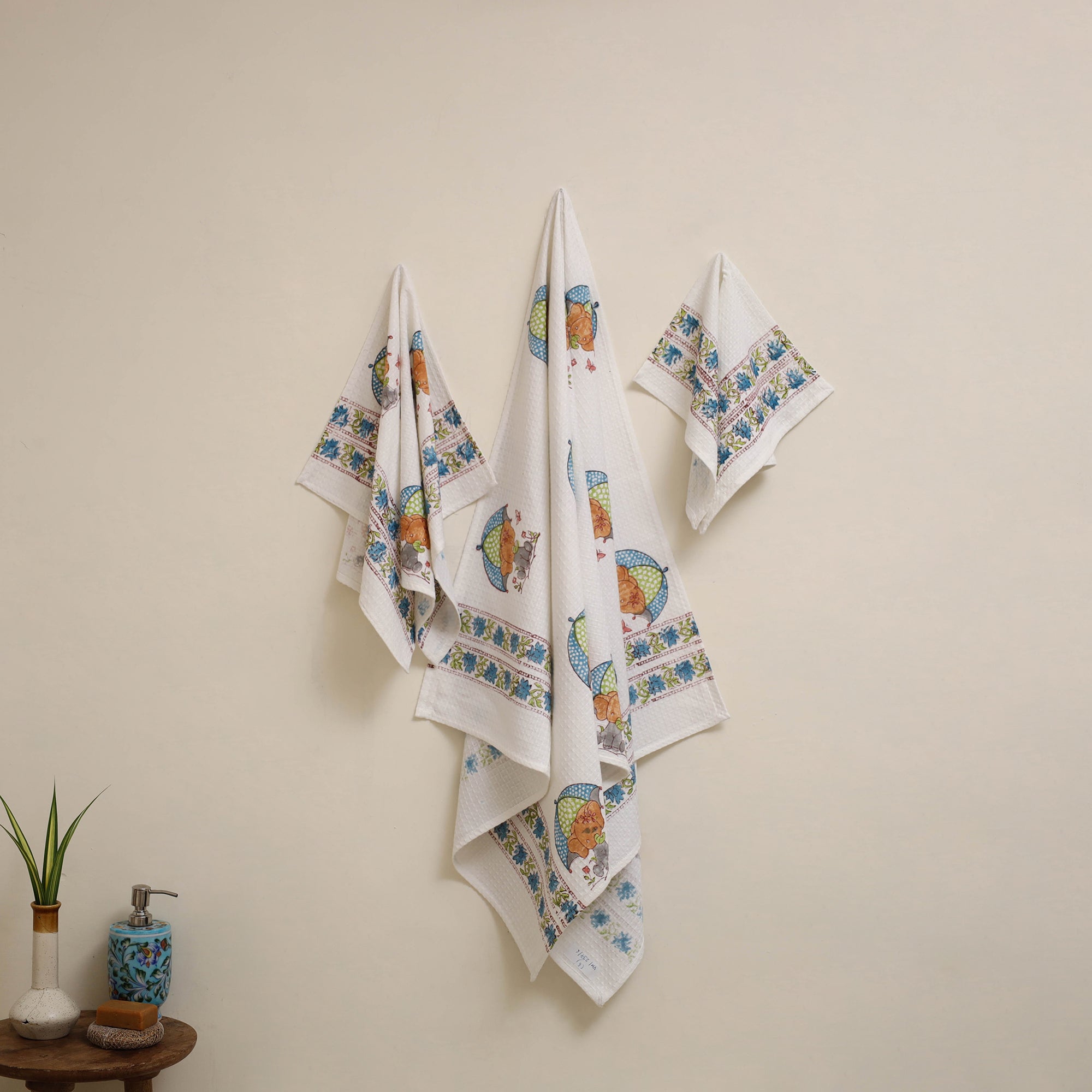 White handwoven cotton sanganeri towels made using traditional block printing techniques from Sanganer, Rajasthan. Crafted from soft and absorbent waffle weave fabric, these towels absorb water quickly and feel light. The set includes a bath towel, hand towel and face towel perfect for daily use or travel.