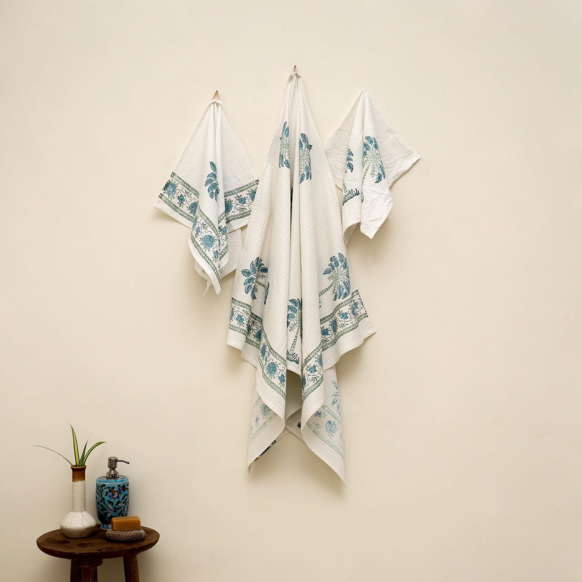 Handwoven cotton sanganeri towels made using traditional block printing techniques from Sanganer, Rajasthan. Crafted from soft and absorbent waffle weave fabric, these towels absorb water quickly and feel light. The set includes a bath towel, hand towel and face towel perfect for daily use or travel.