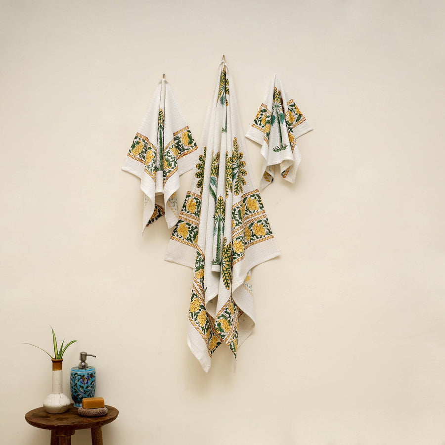 White handwoven cotton sanganeri towels made using traditional block printing techniques from Sanganer, Rajasthan. Crafted from soft and absorbent waffle weave fabric, these towels absorb water quickly and feel light. The set includes a bath towel, hand towel and face towel perfect for daily use or travel.