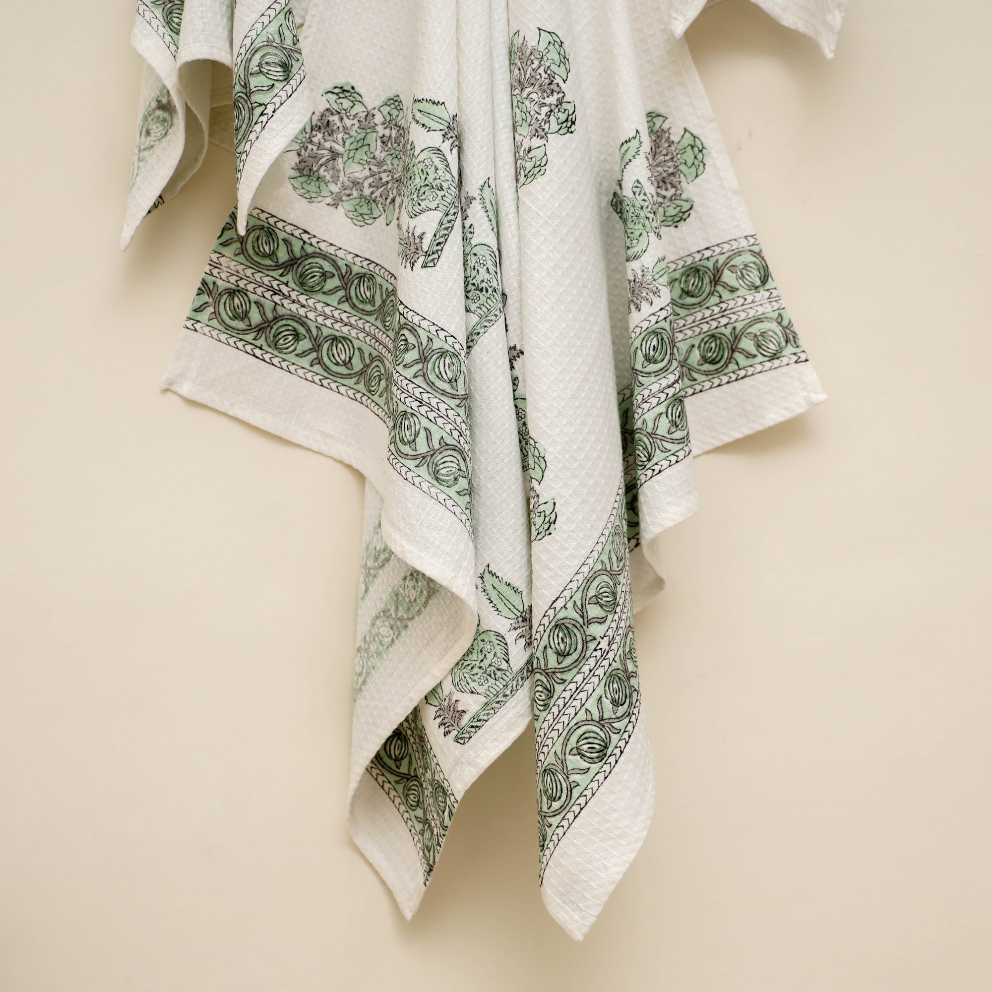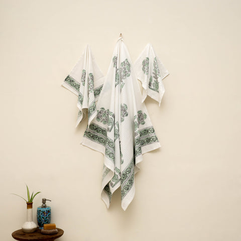 Handwoven cotton sanganeri towels made using traditional block printing techniques from Sanganer, Rajasthan. Crafted from soft and absorbent waffle weave fabric, these towels absorb water quickly and feel light. The set includes a bath towel, hand towel and face towel perfect for daily use or travel.