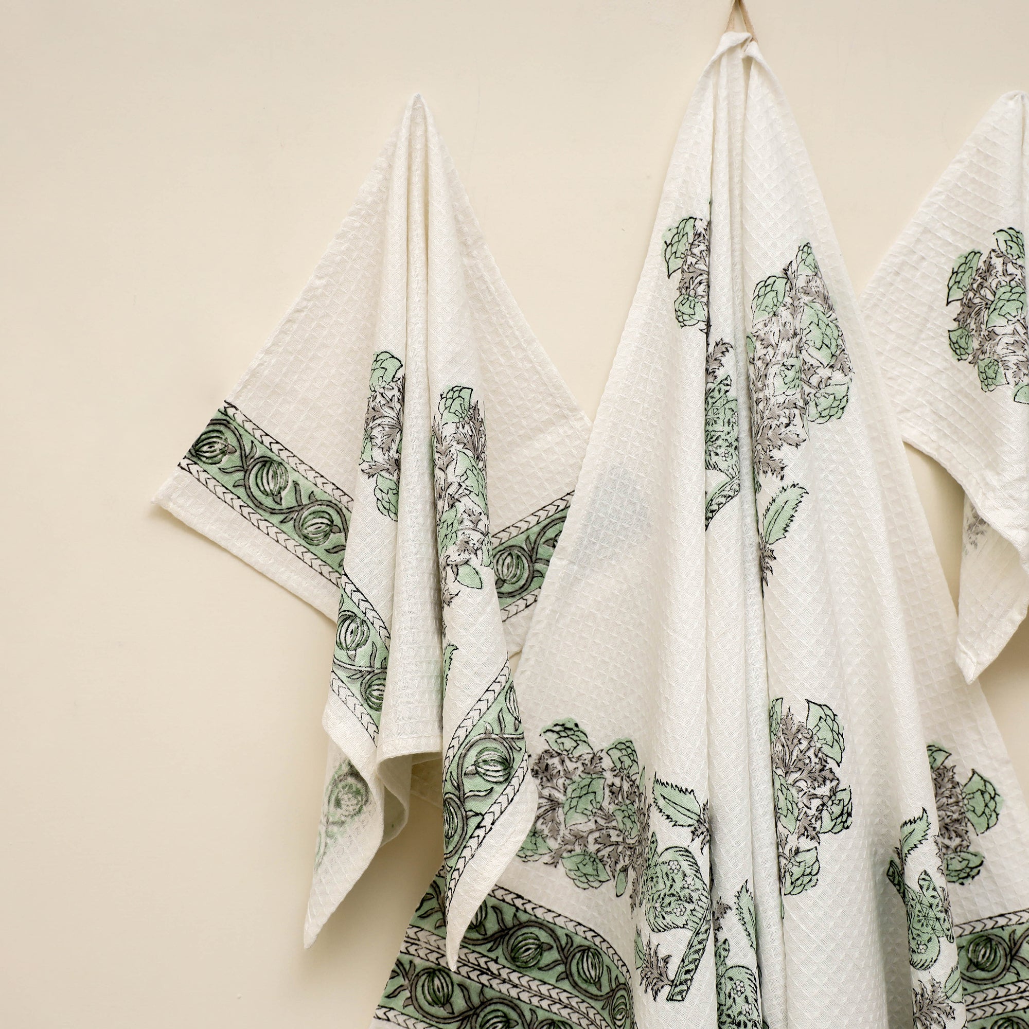 White handwoven cotton sanganeri towels made using traditional block printing techniques from Sanganer, Rajasthan. Crafted from soft and absorbent waffle weave fabric, these towels absorb water quickly and feel light. The set includes a bath towel, hand towel and face towel perfect for daily use or travel.