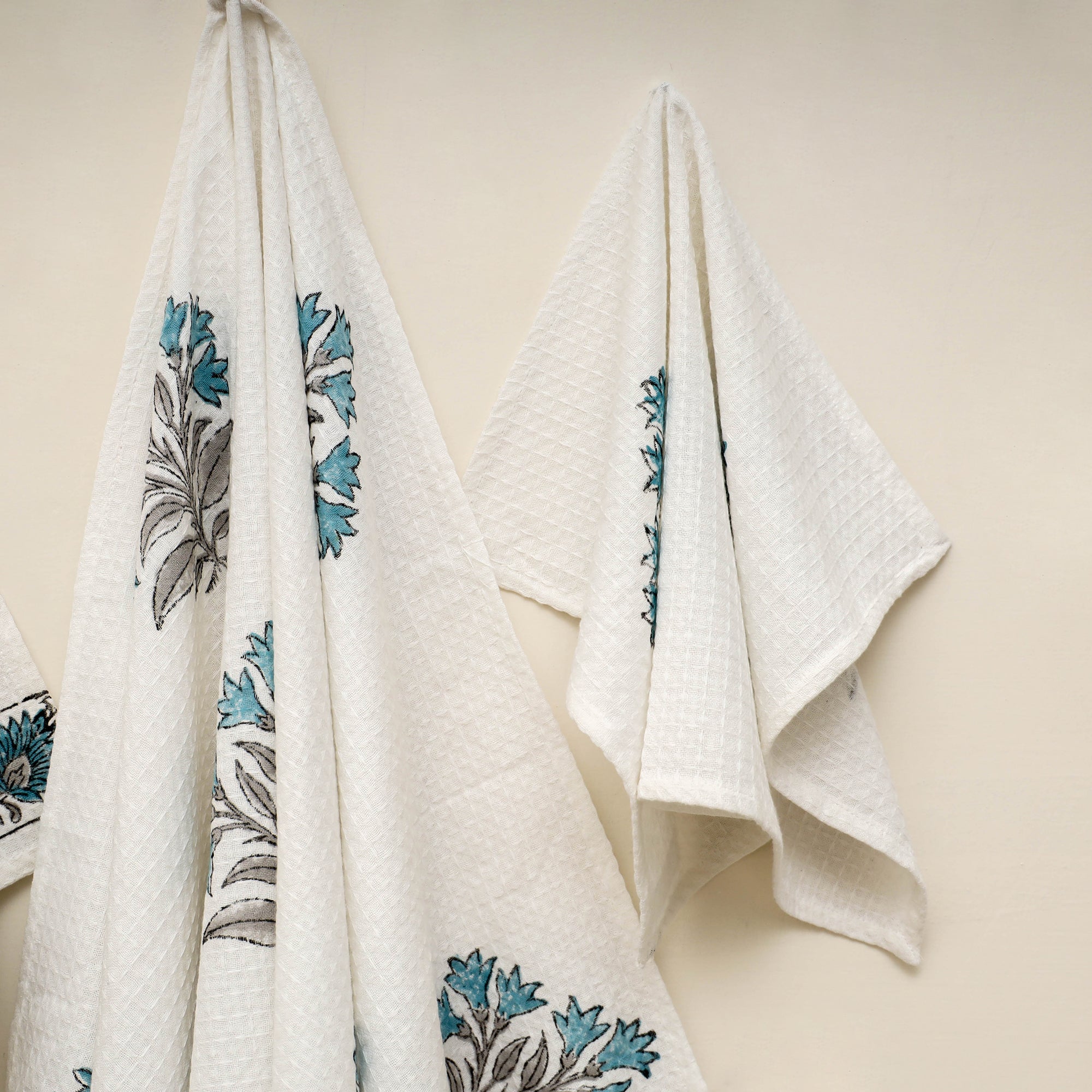 Handwoven cotton sanganeri towels made using traditional block printing techniques from Sanganer, Rajasthan. Crafted from soft and absorbent waffle weave fabric, these towels absorb water quickly and feel light. The set includes a bath towel, hand towel and face towel perfect for daily use or travel.