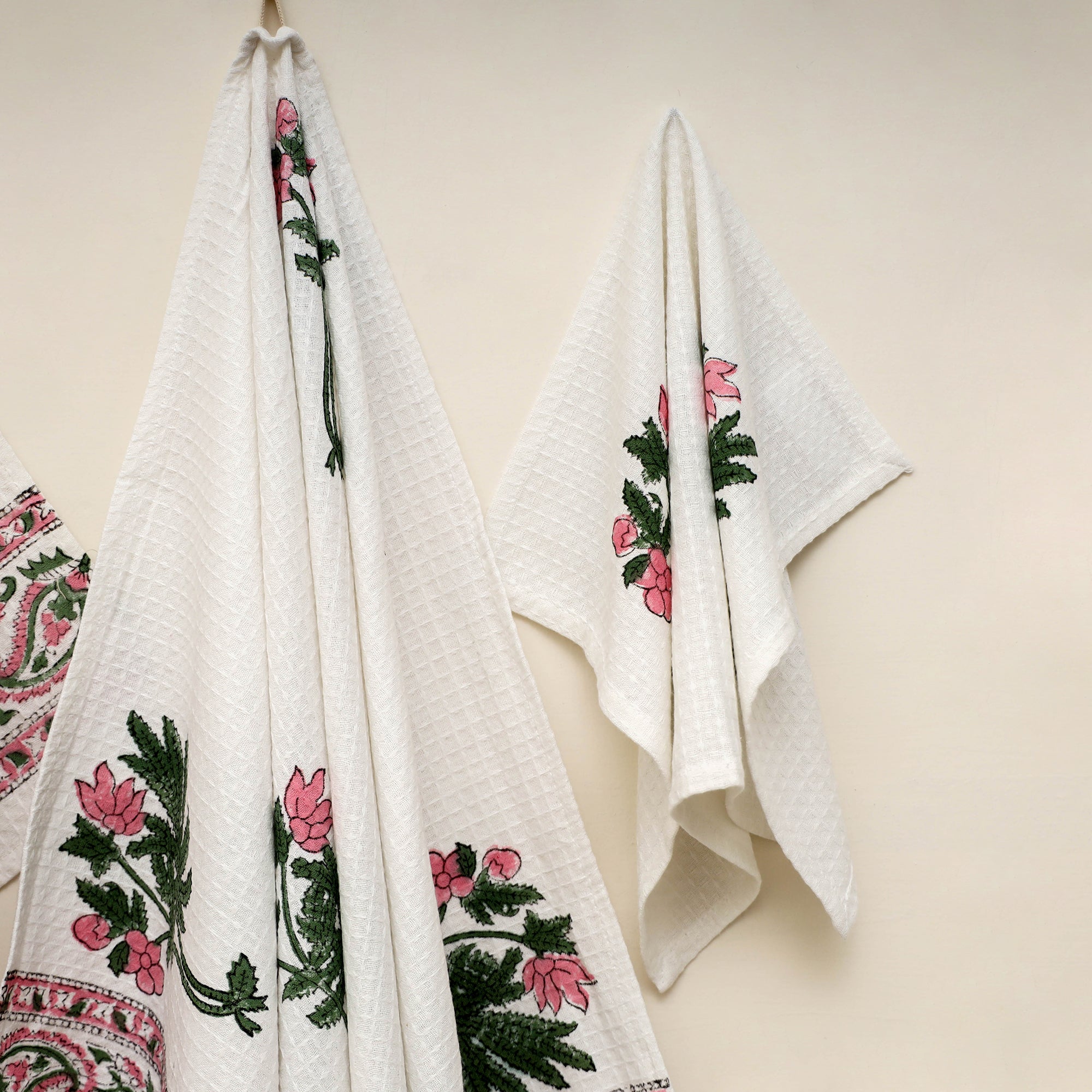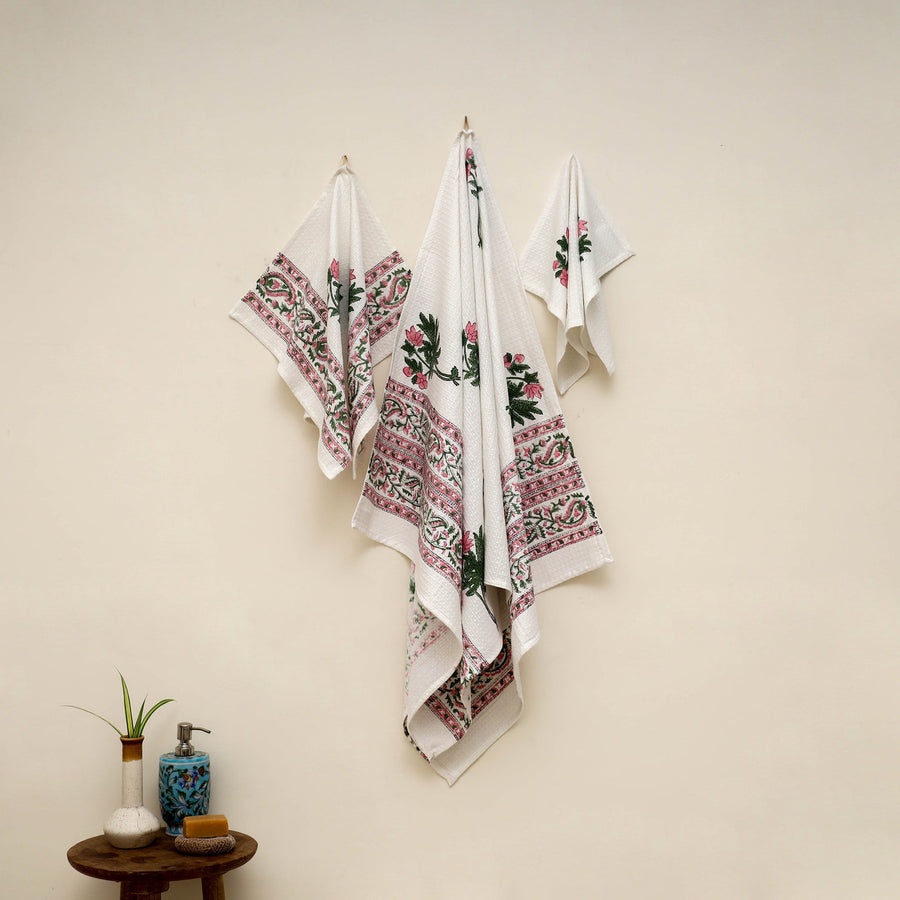Handwoven cotton sanganeri towels made using traditional block printing techniques from Sanganer, Rajasthan. Crafted from soft and absorbent waffle weave fabric, these towels absorb water quickly and feel light. The set includes a bath towel, hand towel and face towel perfect for daily use or travel.