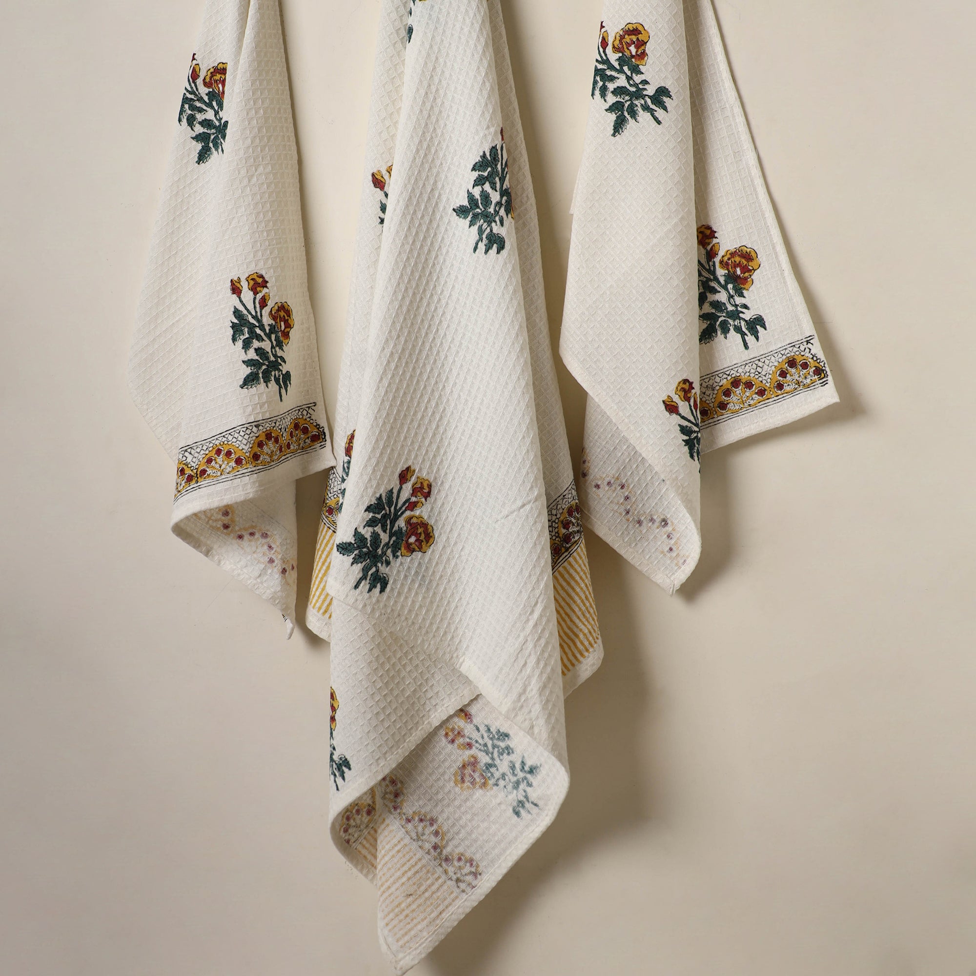 • Buy White Waffle Weave Cotton Sanganeri Print Towel (Set of 3)