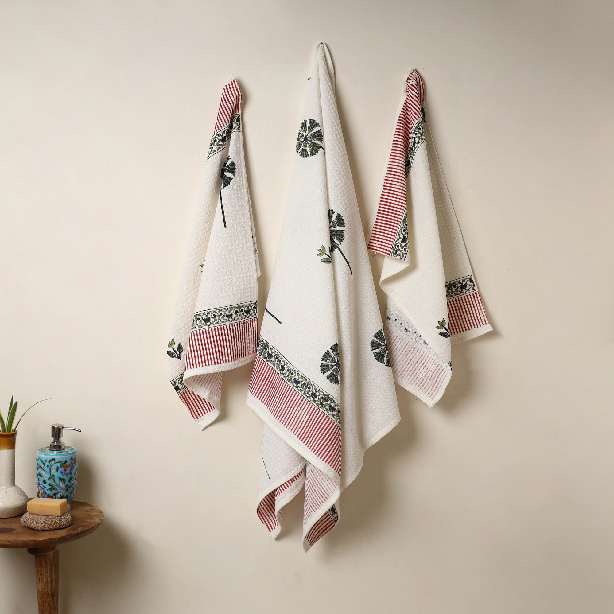 Experience the comfort of white sanganeri cotton towels, crafted using traditional block printing techniques from Sanganer, Rajasthan. Made from soft and absorbent waffle weave fabric, these towels dry quickly and feel lightweight. This set includes one bath towel and two face towels, making it perfect for daily use, travel, and bathing.