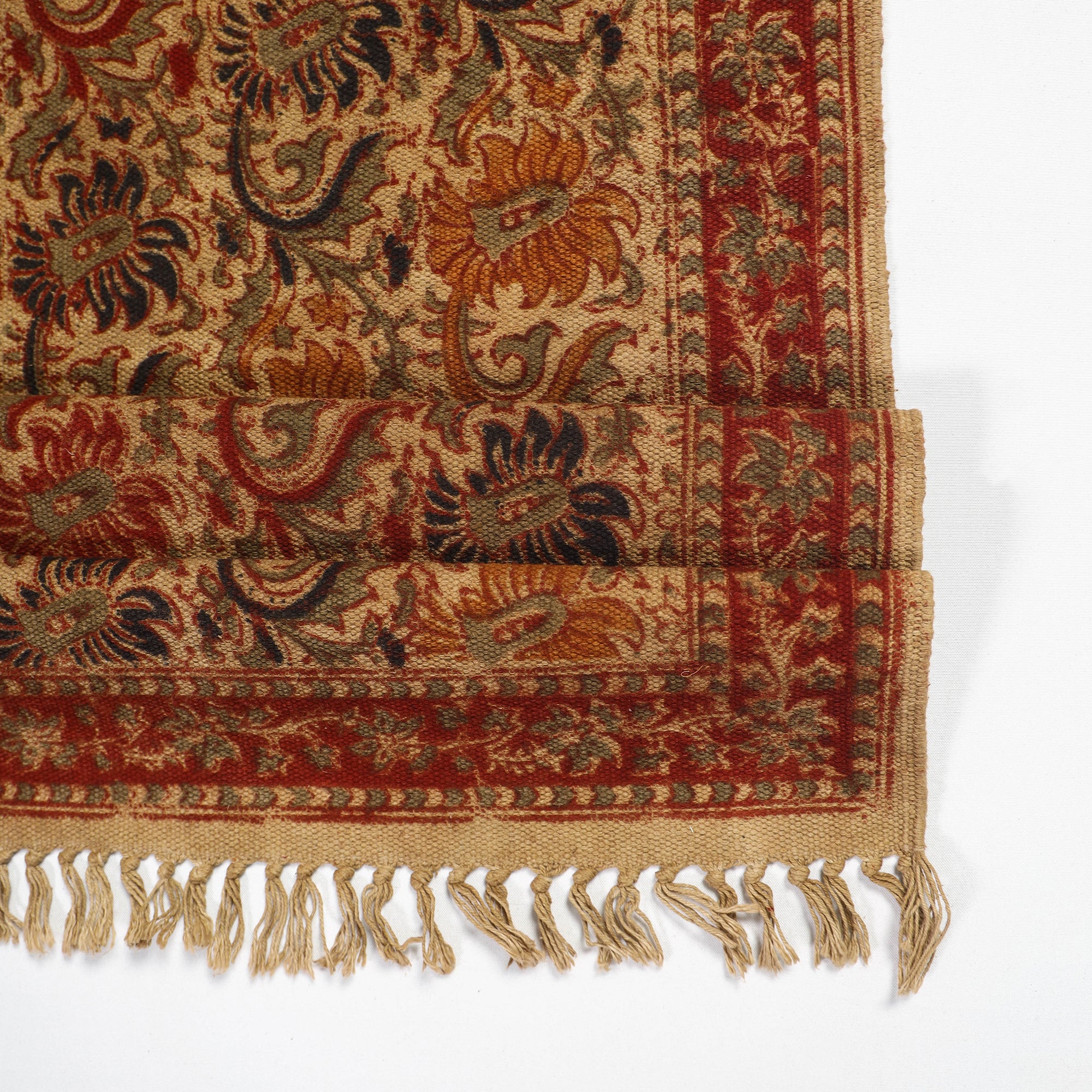 | Material | Elevate your space with this fine-quality red warangal weave cotton carpet/durrie/rug, hand block printed using traditional Kalamkari motifs and natural dyes. Showcasing intricate patterns inspired by ancient Kalamkari painting techniques, this rug blends heritage charm with everyday elegance. Perfect for your living room, bedroom, or hallway, its subtle artistry and eco-conscious make are sure to impress your guests. |