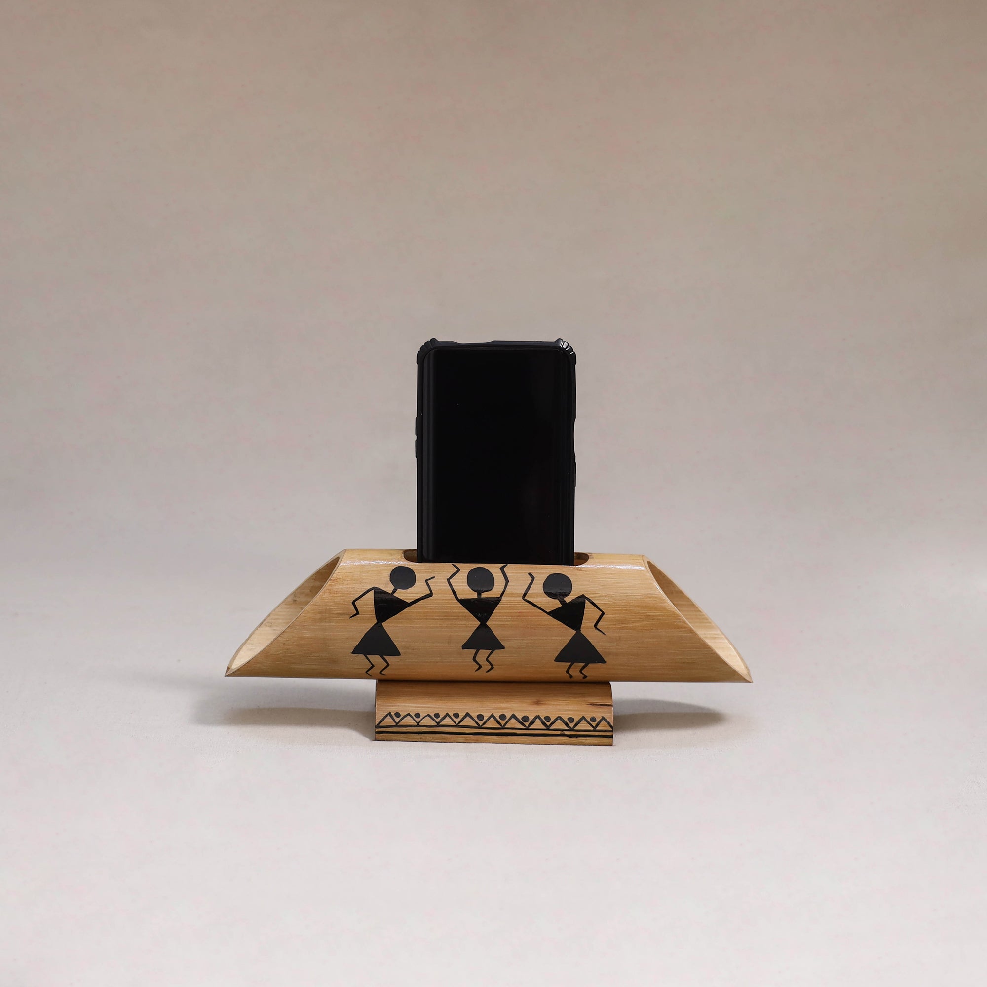 | Material | Handcarved bamboo phone audio amplifier decorated with warli handpainted artwork. Crafted from eco-friendly bamboo and painted using acrylic colors, it features warli art known for simple geometric figures and scenes of daily life. The hollow bamboo tube is open at both ends and designed to hold a phone at the top while resting on a flat surface. Its natural resonance amplifies sound, making it useful at home, in the garden, at the beach, barbecues or during camping. |