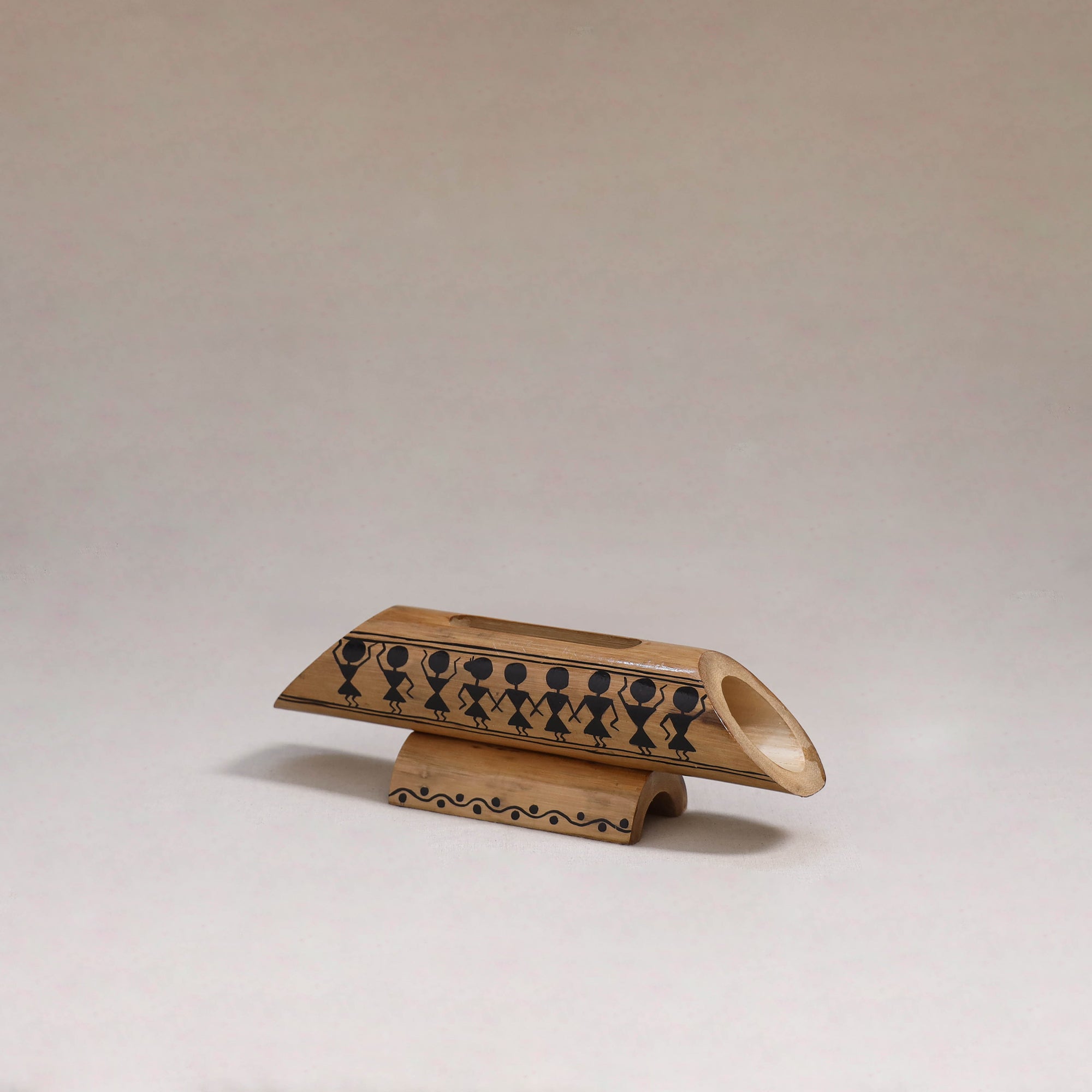 Handcarved bamboo phone audio amplifier decorated with warli handpainted artwork. Crafted from eco-friendly bamboo and painted using acrylic colors, it features warli art known for simple geometric figures and scenes of daily life. The hollow bamboo tube is open at both ends and designed to hold a phone at the top while resting on a flat surface. Its natural resonance amplifies sound, making it useful at home, in the garden, at the beach, barbecues or during camping.