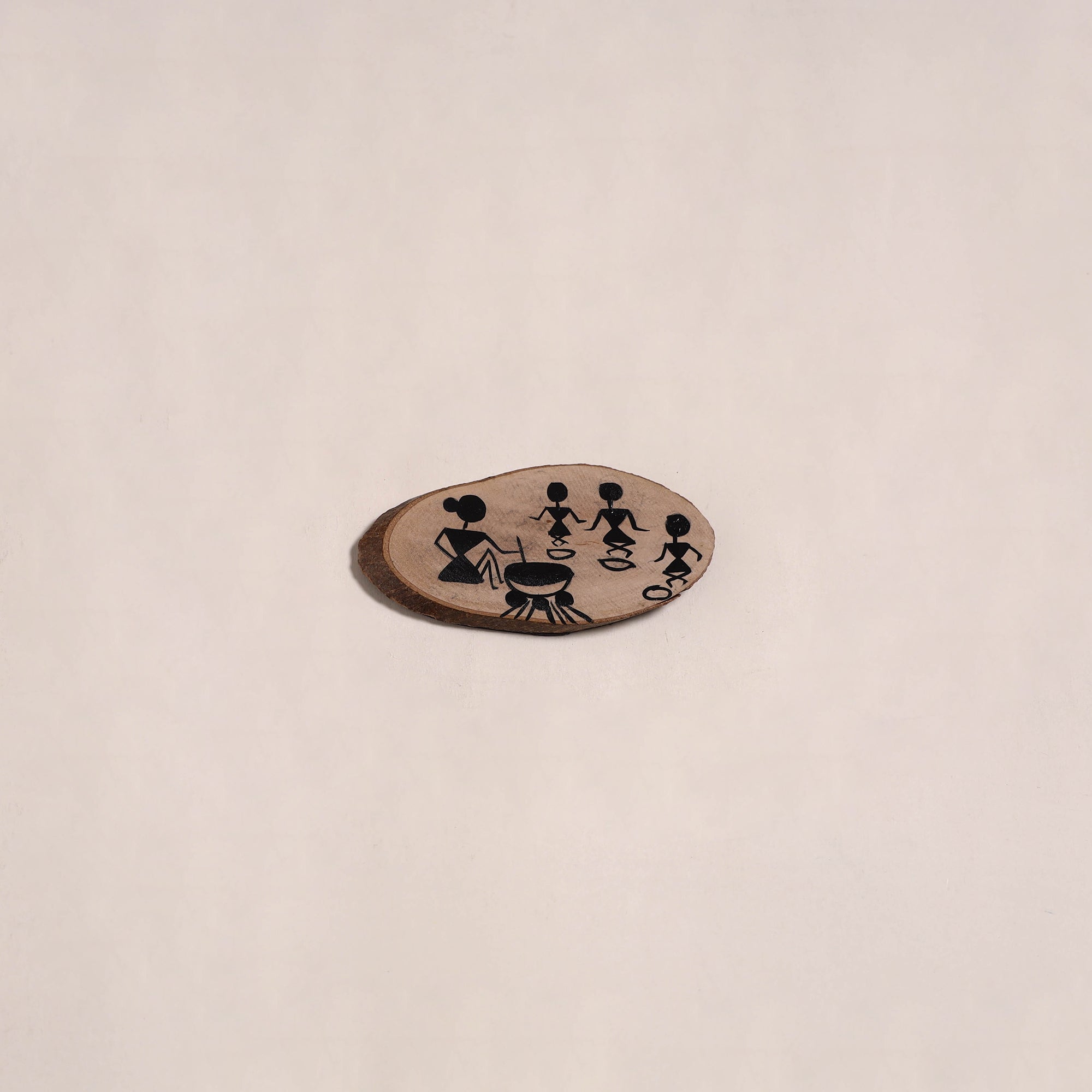 Brown handpainted fridge magnet crafted on wood using acrylic colors. It showcases the warli art known for its simple geometric figures and scenes of daily life. This magnet adds a touch of art and charm to your fridge or any metal surface.