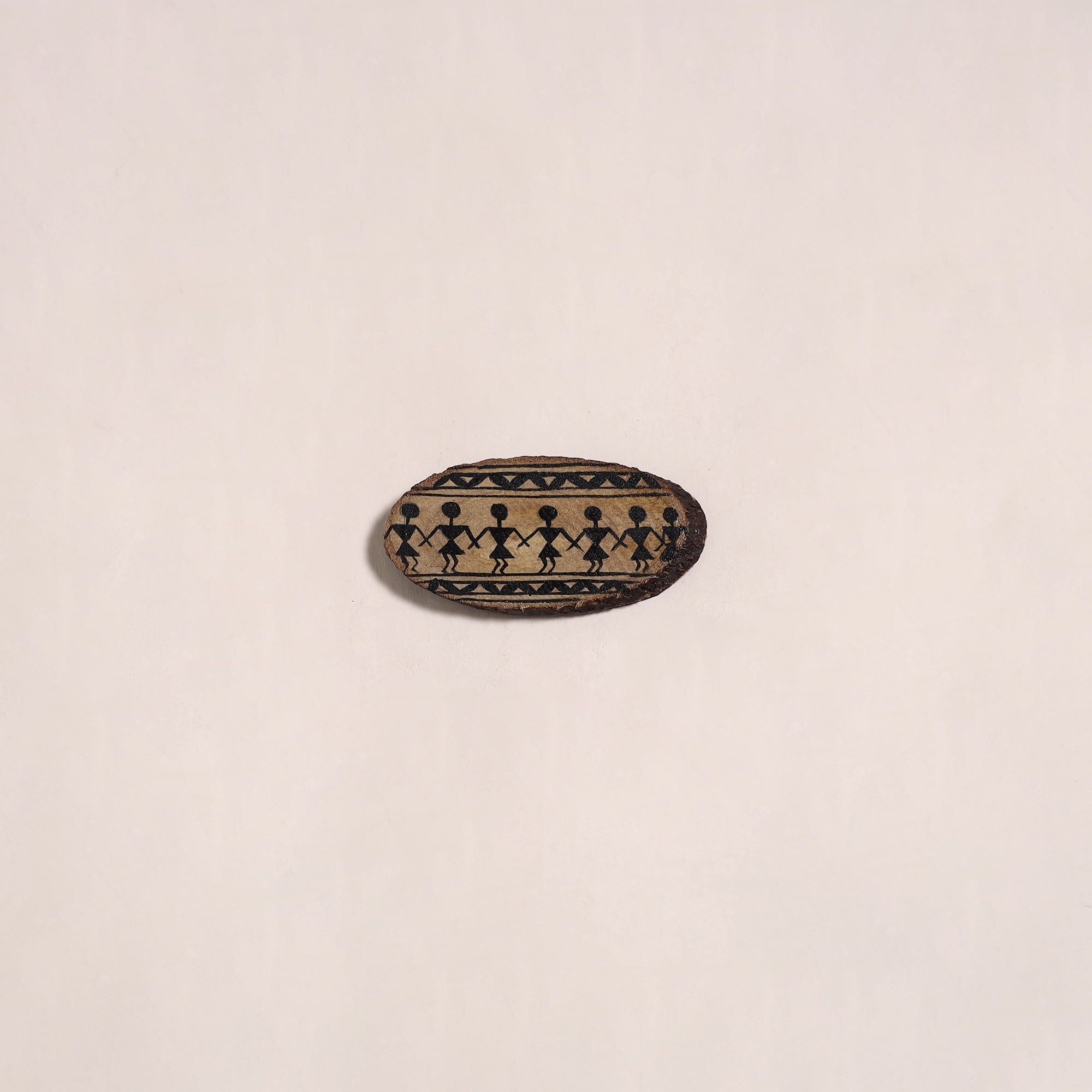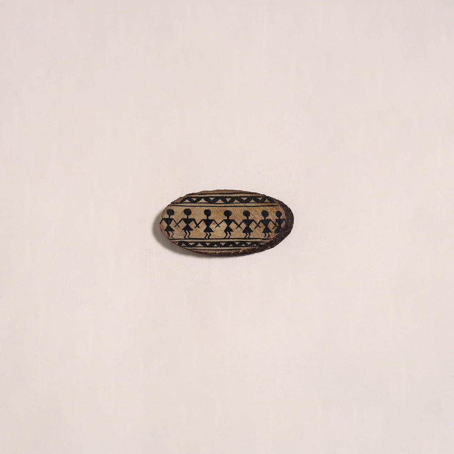 Brown handpainted fridge magnet crafted on wood using acrylic colors. It showcases the warli art known for its simple geometric figures and scenes of daily life. This magnet adds a touch of art and charm to your fridge or any metal surface.