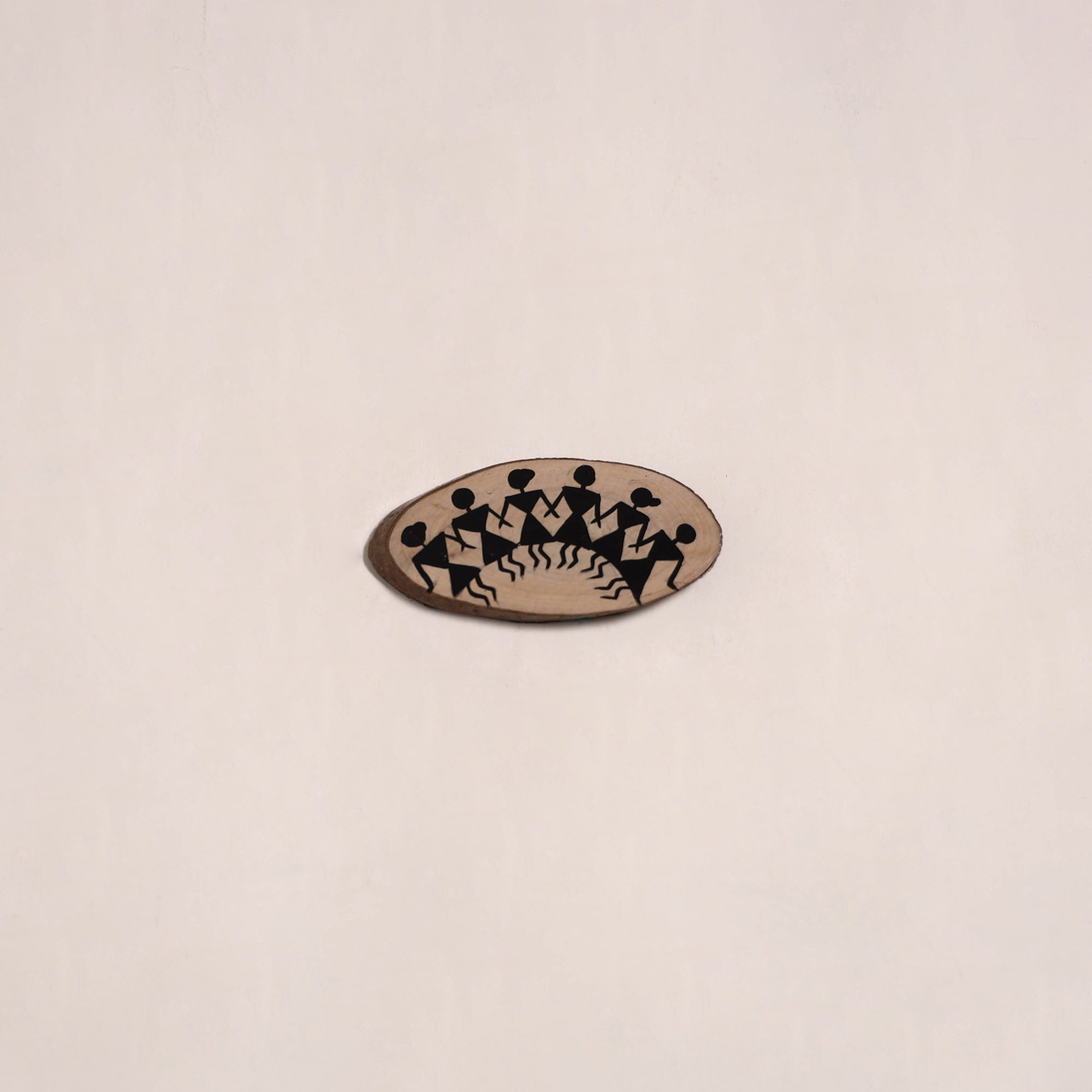 Brown handpainted fridge magnet crafted on wood using acrylic colors. It showcases the warli art known for its simple geometric figures and scenes of daily life. This magnet adds a touch of art and charm to your fridge or any metal surface.