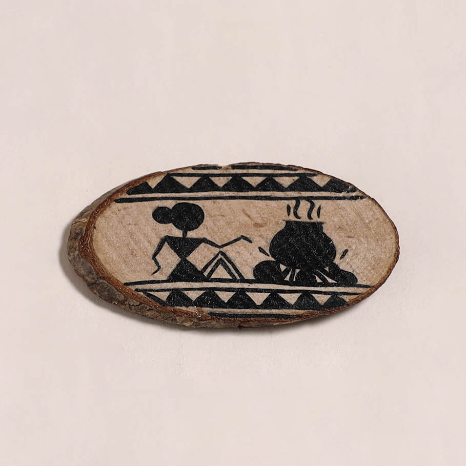 Brown handpainted fridge magnet crafted on wood using acrylic colors. It showcases the warli art known for its simple geometric figures and scenes of daily life. This magnet adds a touch of art and charm to your fridge or any metal surface.