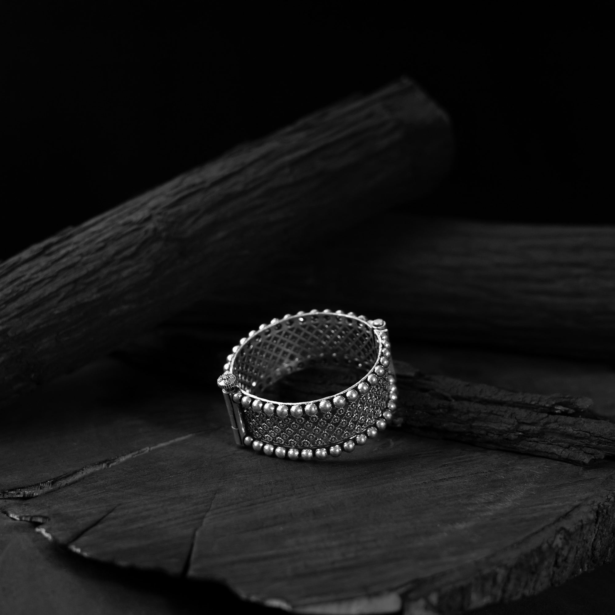 This handcrafted white oxidised bangle features a silver tone finish with elegant detailing and timeless appeal. Perfect for festive occasions, weddings office wear, or casual outings this bangle pairs beautifully with sarees, kurtas, or contemporary outfits. A meaningful gift for your mother, sister, wife, or girlfriend adding a beautiful touch of tradition to every moment.
