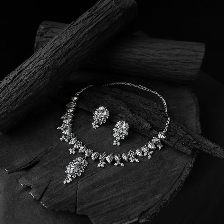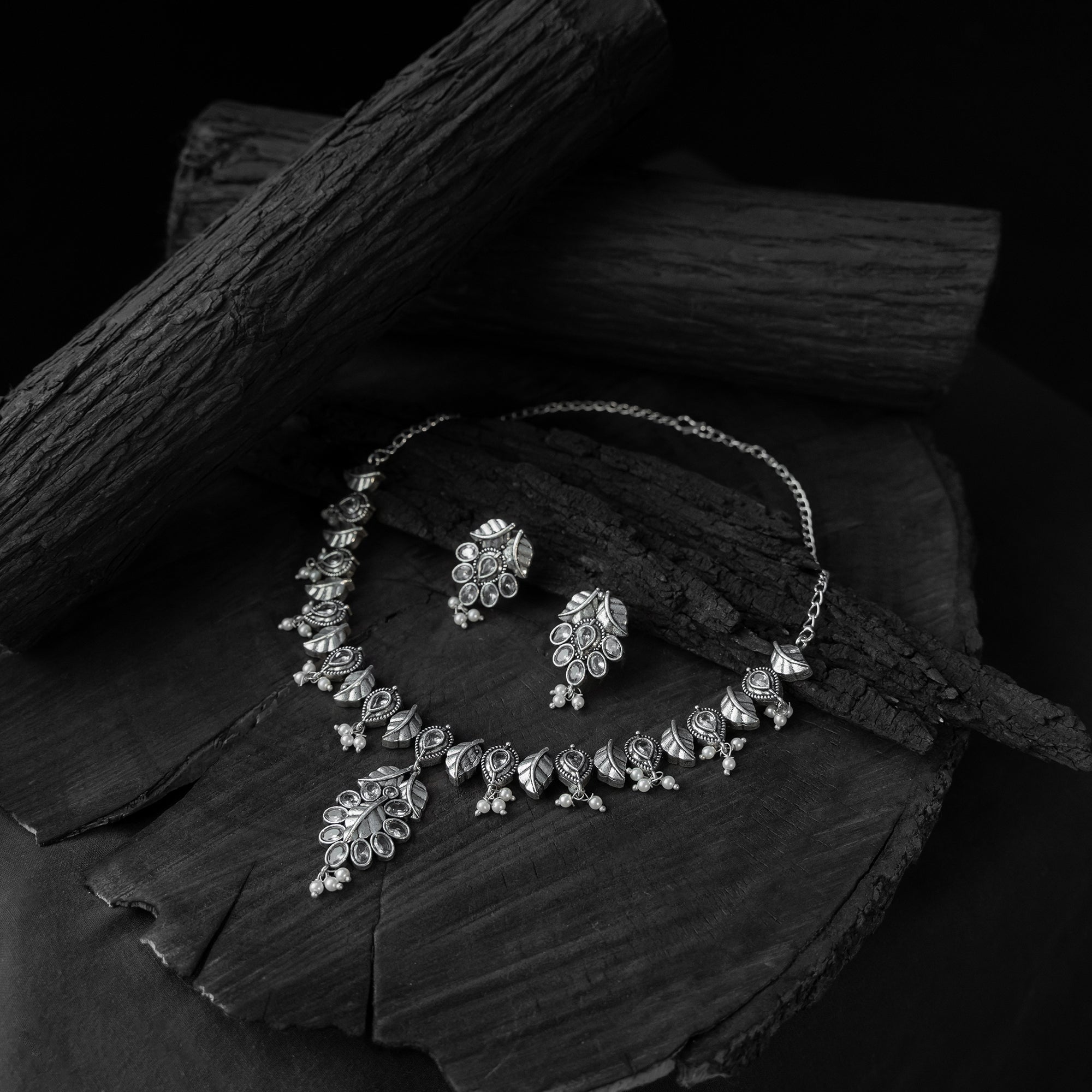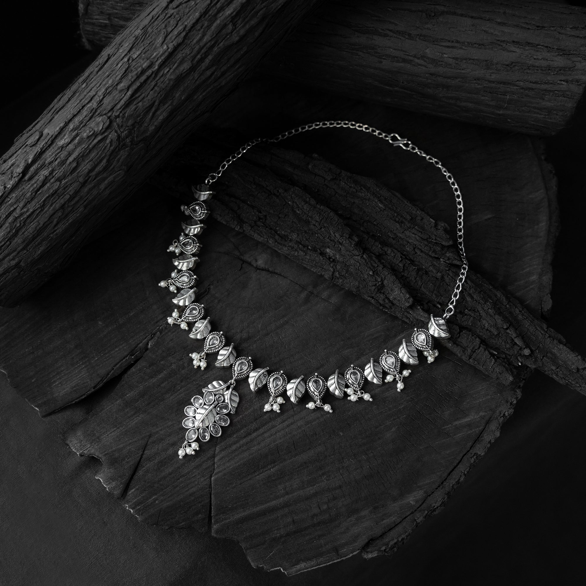 Oxidised handcrafted white necklace set features intricate detailing using varied materials like metal, stones, pearls and artistic motifs. Perfect for festive occasions, weddings, office wear or casual styling it pairs beautifully with sarees, kurtas, or contemporary outfits. Complete with matching earrings, this set makes for a thoughtful gift for mother, sister, wife, or girlfriend adding beauty and grace to every special moment.