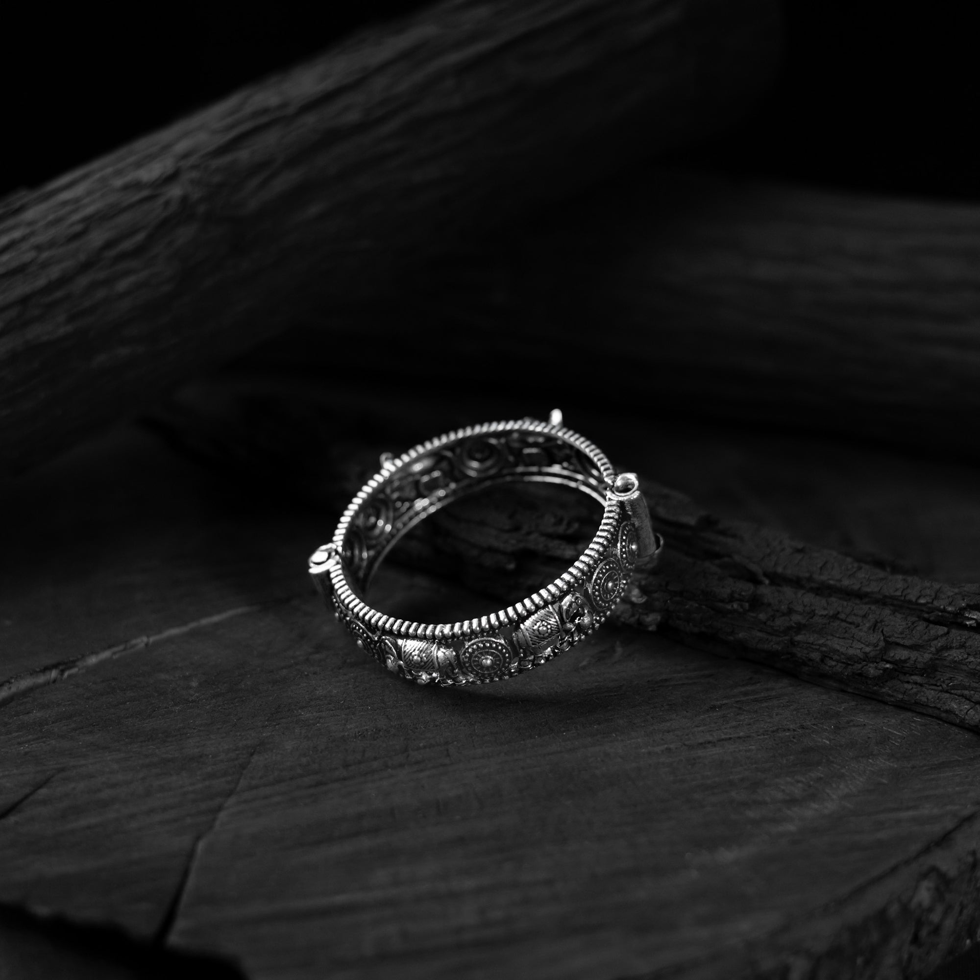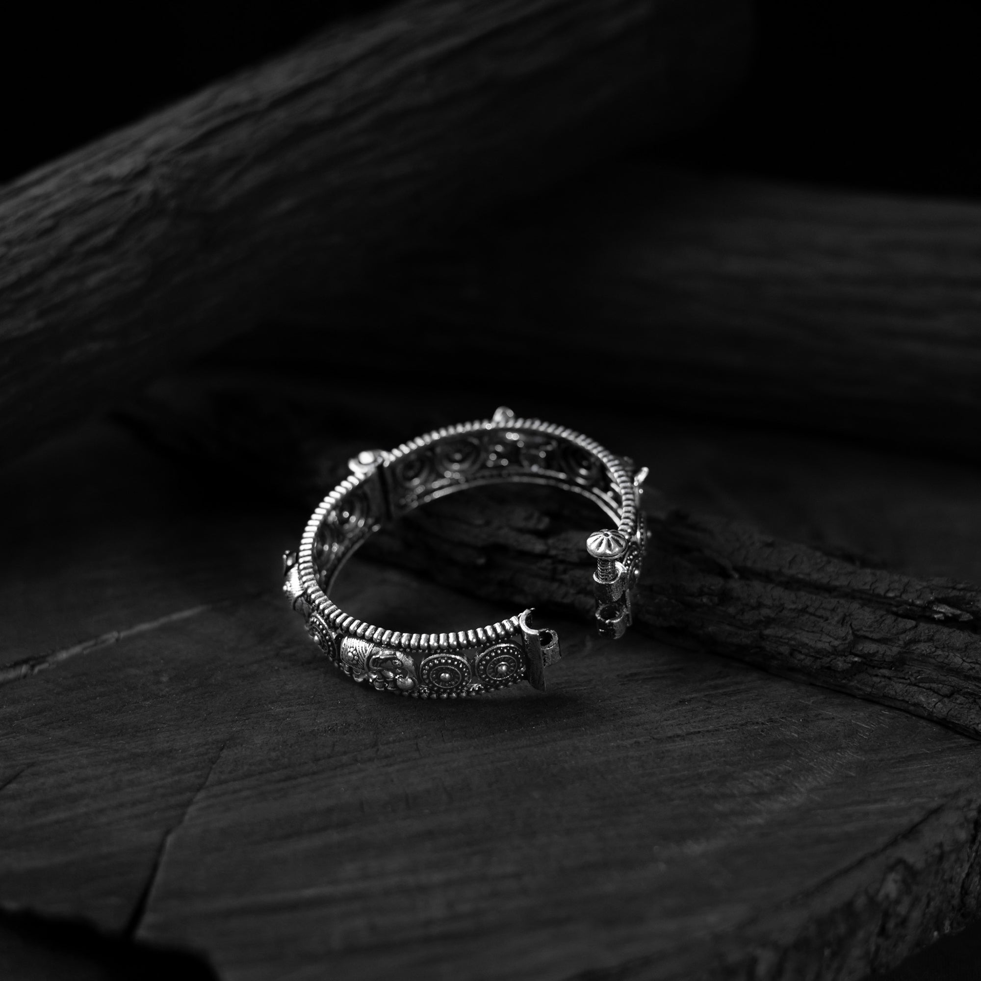This handcrafted white oxidised bangle features a silver tone finish with elegant detailing and timeless appeal. Perfect for festive occasions, weddings office wear, or casual outings this bangle pairs beautifully with sarees, kurtas, or contemporary outfits. A meaningful gift for your mother, sister, wife, or girlfriend adding a beautiful touch of tradition to every moment.