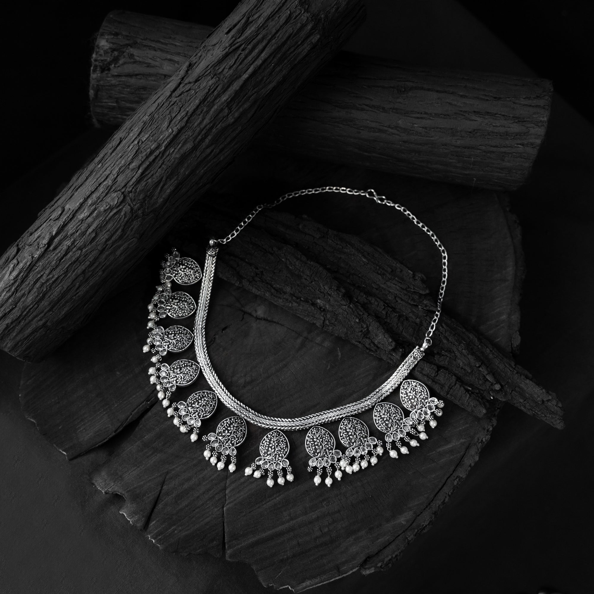 Oxidised handcrafted white necklace set features intricate detailing using varied materials like metal, beads, and artistic motifs. Perfect for festive occasions, weddings, office wear, or casual styling, it pairs beautifully with sarees, kurtas, or contemporary outfits. Complete with matching earrings, this set makes for a thoughtful gift for mother, sister, wife, or girlfriend adding beauty and grace to every special moment.