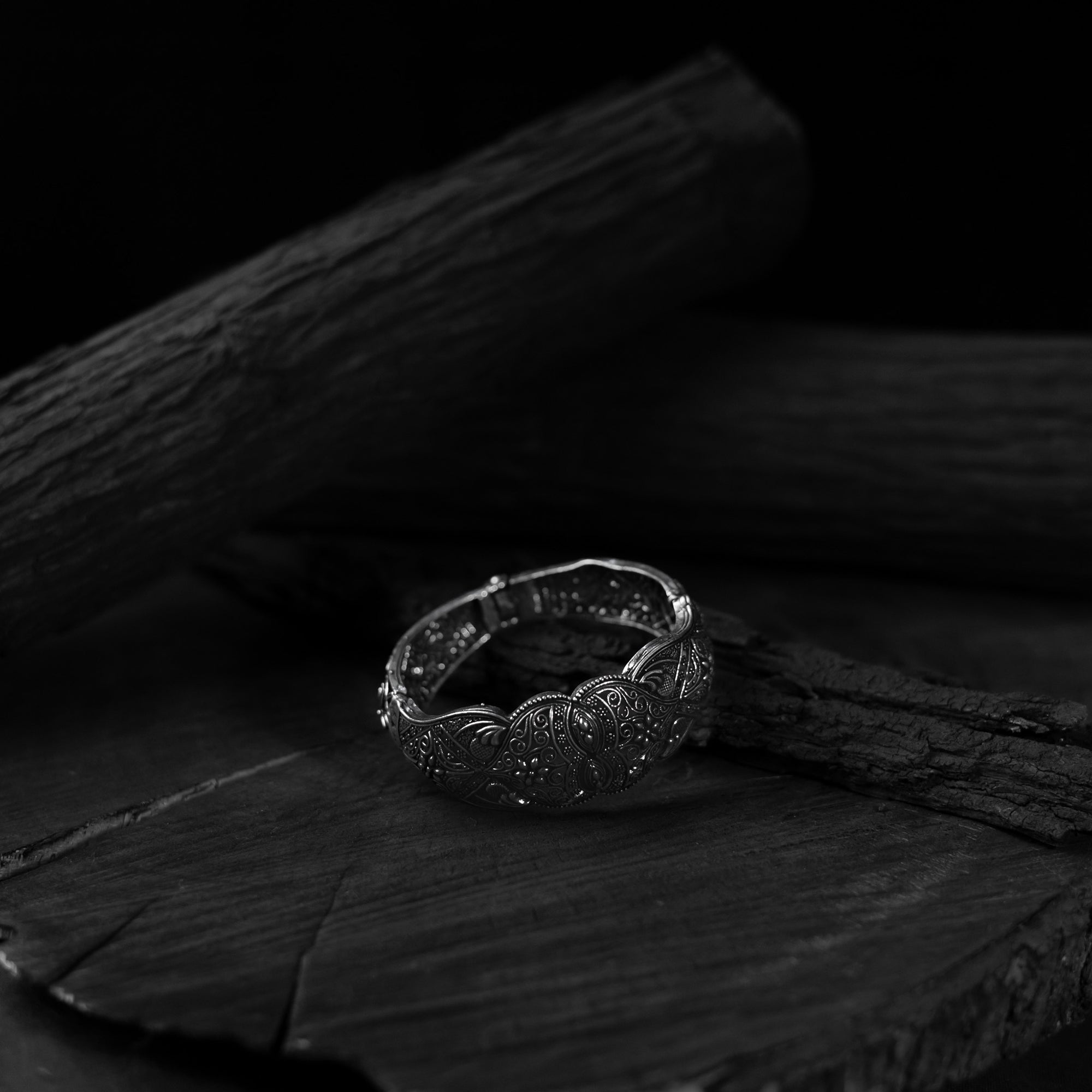 This handcrafted white oxidised bangle features a silver tone finish with elegant detailing and timeless appeal. Perfect for festive occasions, weddings office wear, or casual outings this bangle pairs beautifully with sarees, kurtas, or contemporary outfits. A meaningful gift for your mother, sister, wife, or girlfriend adding a beautiful touch of tradition to every moment.