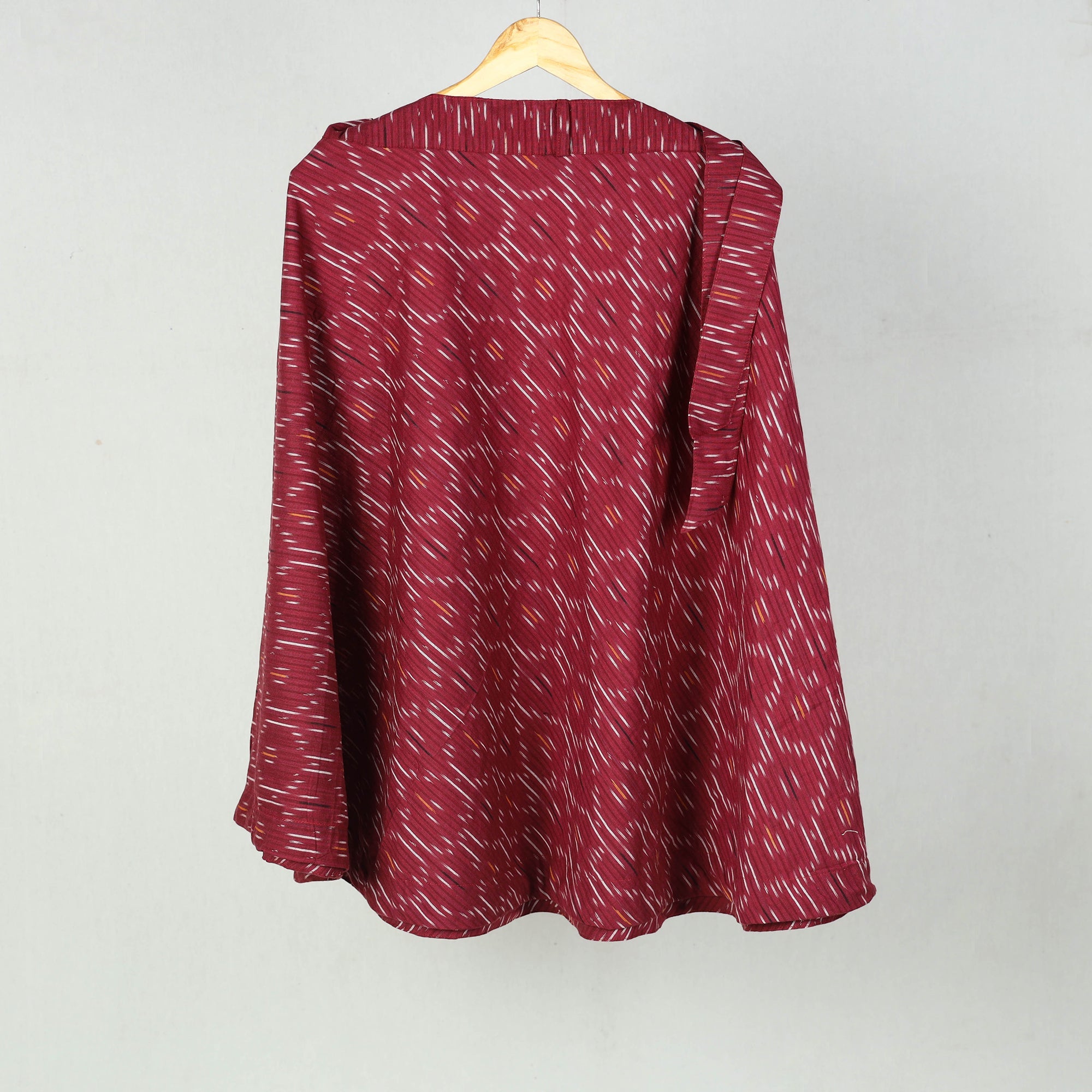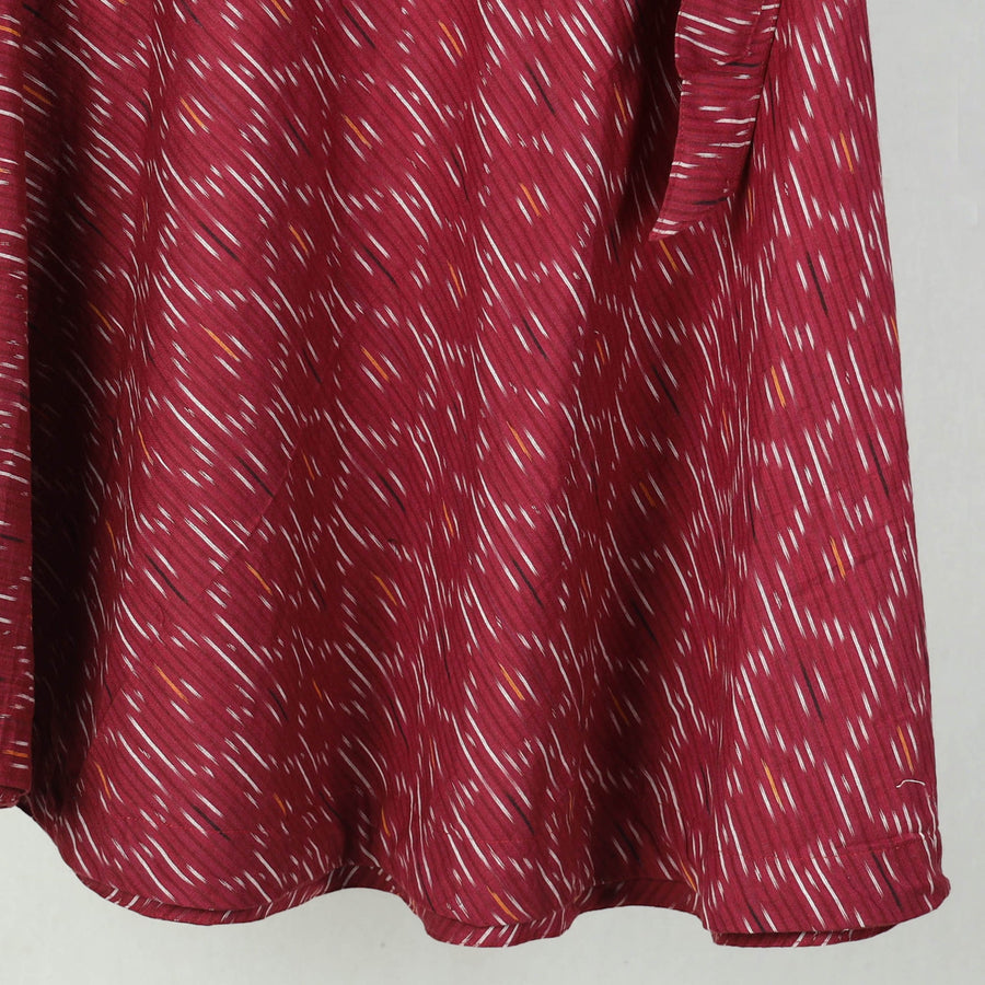 Wrap yourself in the tradition with our dark red wrap around cotton pochampally ikat skirt . Showcasing the intricate patterns of the ikat weaving technique, this wrap-around skirt is a testament to Indias rich textile heritage. Crafted from eco-friendly cotton, it breathable comfort and a customizable fit with its waist tie-up closure. Ideal for casual days or festive evenings, it effortlessly blends cultural artistry with modern fashion.