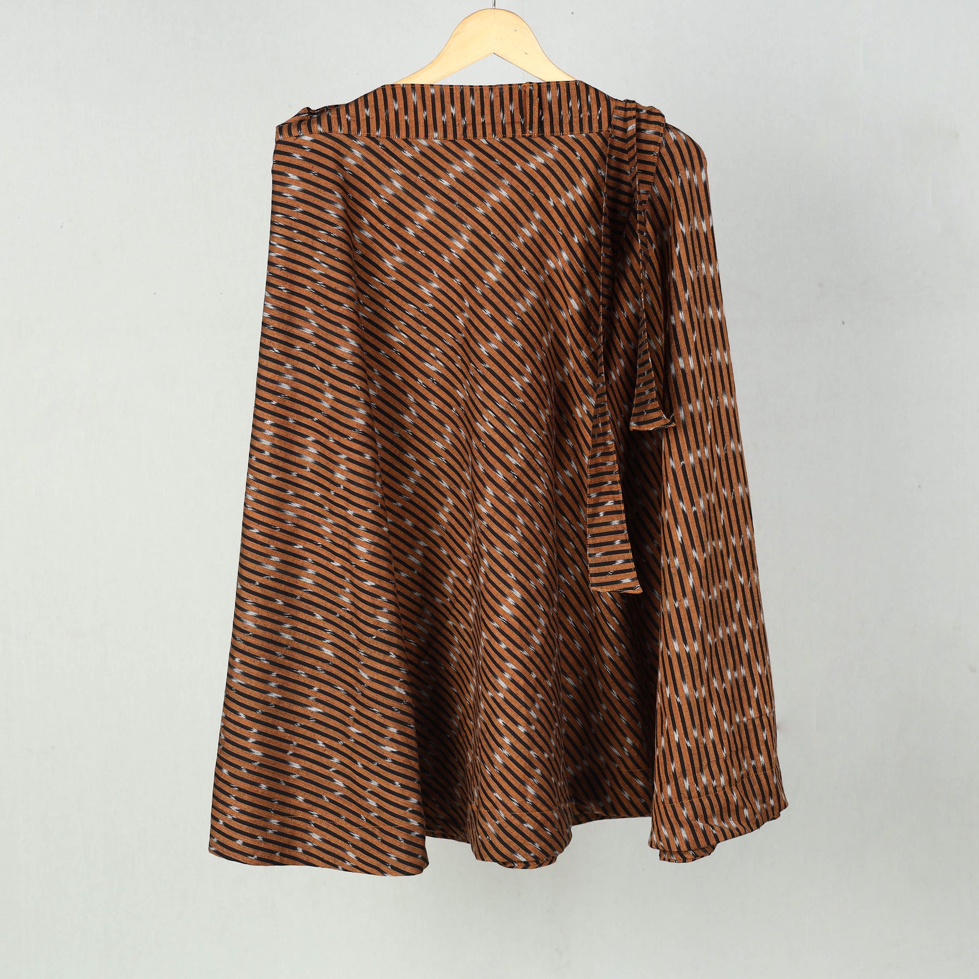 Wrap yourself in the tradition with our brown wrap around cotton pochampally ikat skirt . Showcasing the intricate patterns of the ikat weaving technique, this wrap-around skirt is a testament to Indias rich textile heritage. Crafted from eco-friendly cotton, it breathable comfort and a customizable fit with its waist tie-up closure. Ideal for casual days or festive evenings, it effortlessly blends cultural artistry with modern fashion.